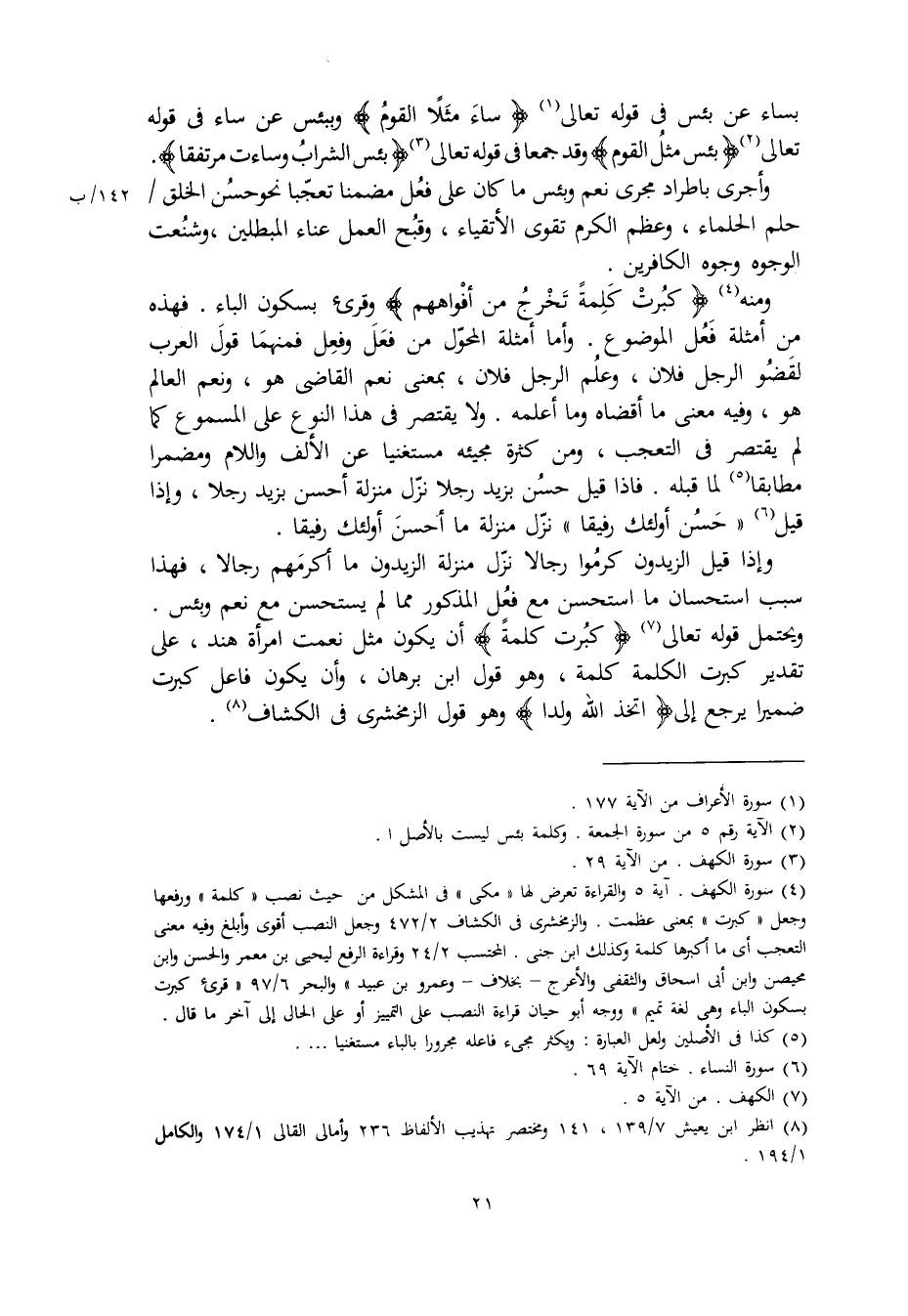 وإذا قيل الزيدون كرُمُوا رجالا نزّل منزلة الزيدون ما أكرمَهم رجالا، فهذا سبب استحسان مع فعُل المذكور مما لم يستحسن مع نعم وبئس. ويحتمل قوله تعالى (كبُرت كلمةً) أن يكون مثل نعمت امرأة هند، على تقدير كبرت الكلمة كلمة، وهو قول ابن برهان، وأن يكون فاعل كبرت ضميرا يرجع إلى (اتخذ الله ولدا) وهو قول الزمخشري في الكشاف.