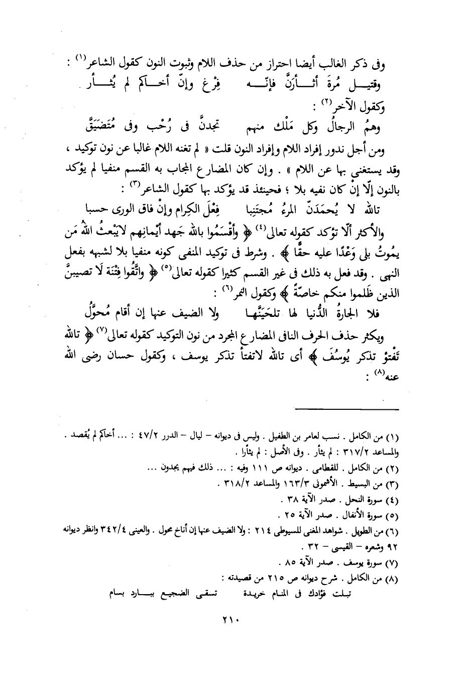 ويكثر حذف الحرف النافي المضارع المجرد من نون التوكيد كقوله تعالى (تالله تَفْتؤ تذكر يوسفَ) أي تالله لا تفتأ تذكر يوسف، وكقول حسان رضي الله عنه: