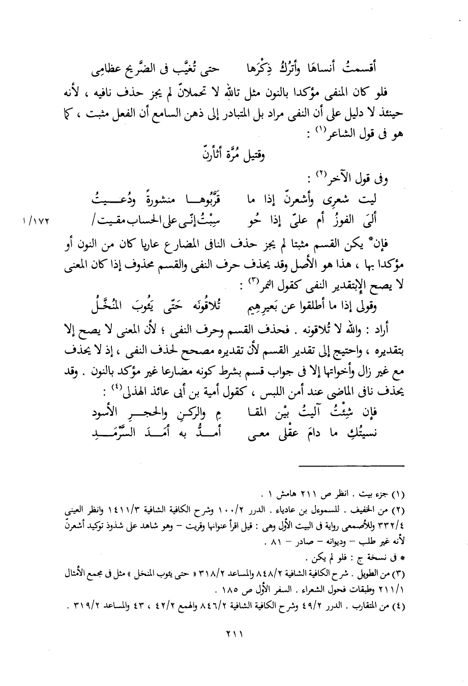 فإن يكن القسم مثبتا لم يجز حذف النافي المضارع عاريا كان من النون أو مؤكدا بها، هذا هو الأصل وقد يحذف حرف النفي والقسم محذوف إذا كان المعنى لا يصح إلا بتقدير النفي كقول النمر: