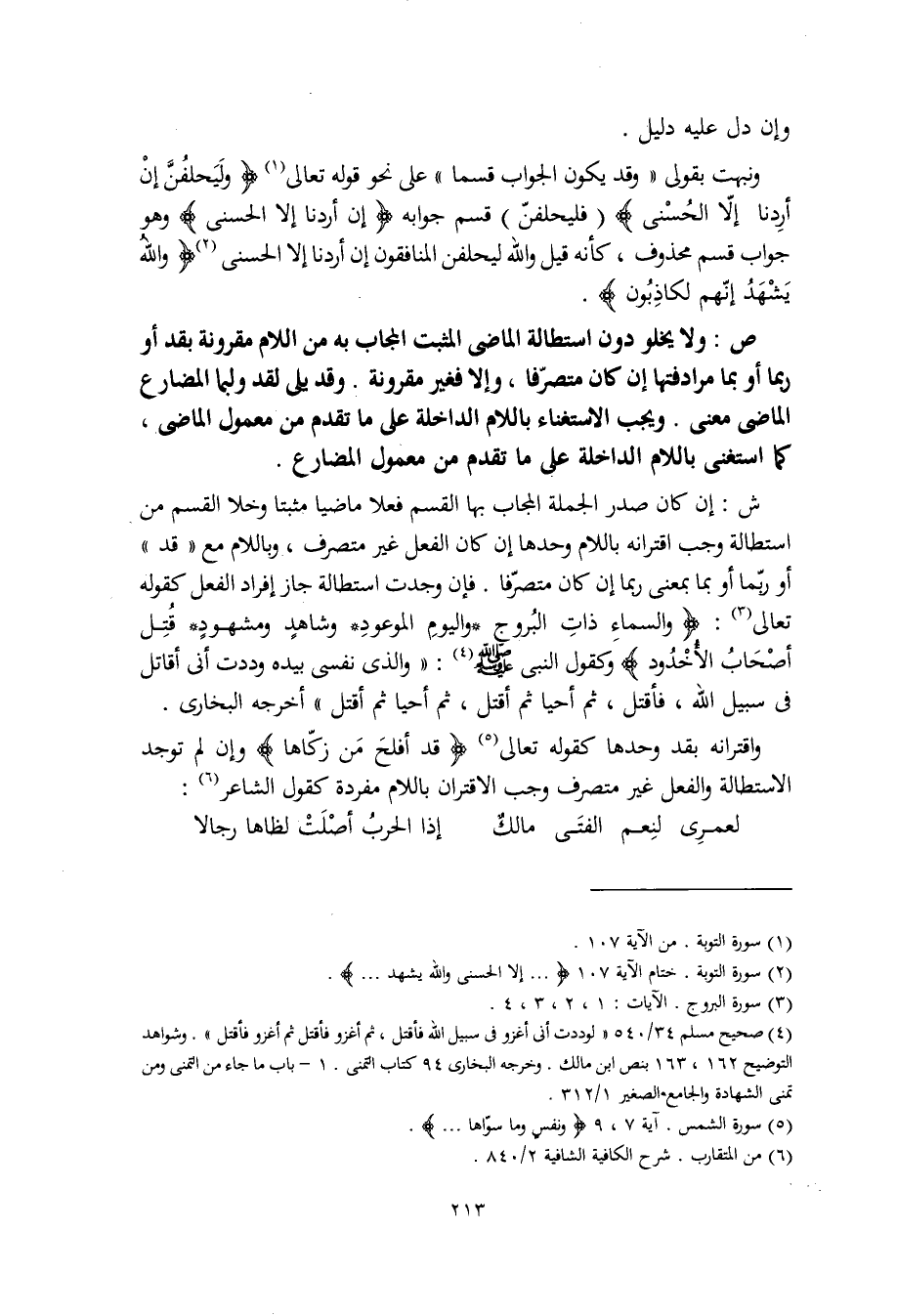 ش: إن كان صدر الجملة المجاب بها القسم فعلا ماضيا مثبتا وخلا القسم من استطالة وجب اقترانه باللام وحدها إن كان الفعل غير متصرف، وباللام مع "قد" أو ربّما أو بما بمعنى ربما إن كان متصرّفا. فإن وجدت استطالة جاز إفراد الفعل كقوله تعالى: (والسماءِ ذات البروج * واليوم الموعود * وشاهدٍ ومشهودٍ * قُتِل أصحابُ الأخدود) وكقول النبي صلى الله عليه وسلم: "والذي نفسي بيده وددت أني أقاتل في سبيل الله، فأقتل، ثم أحيا ثم أقتل، ثم أحيا ثم أقتل" أخرجه البخاري.