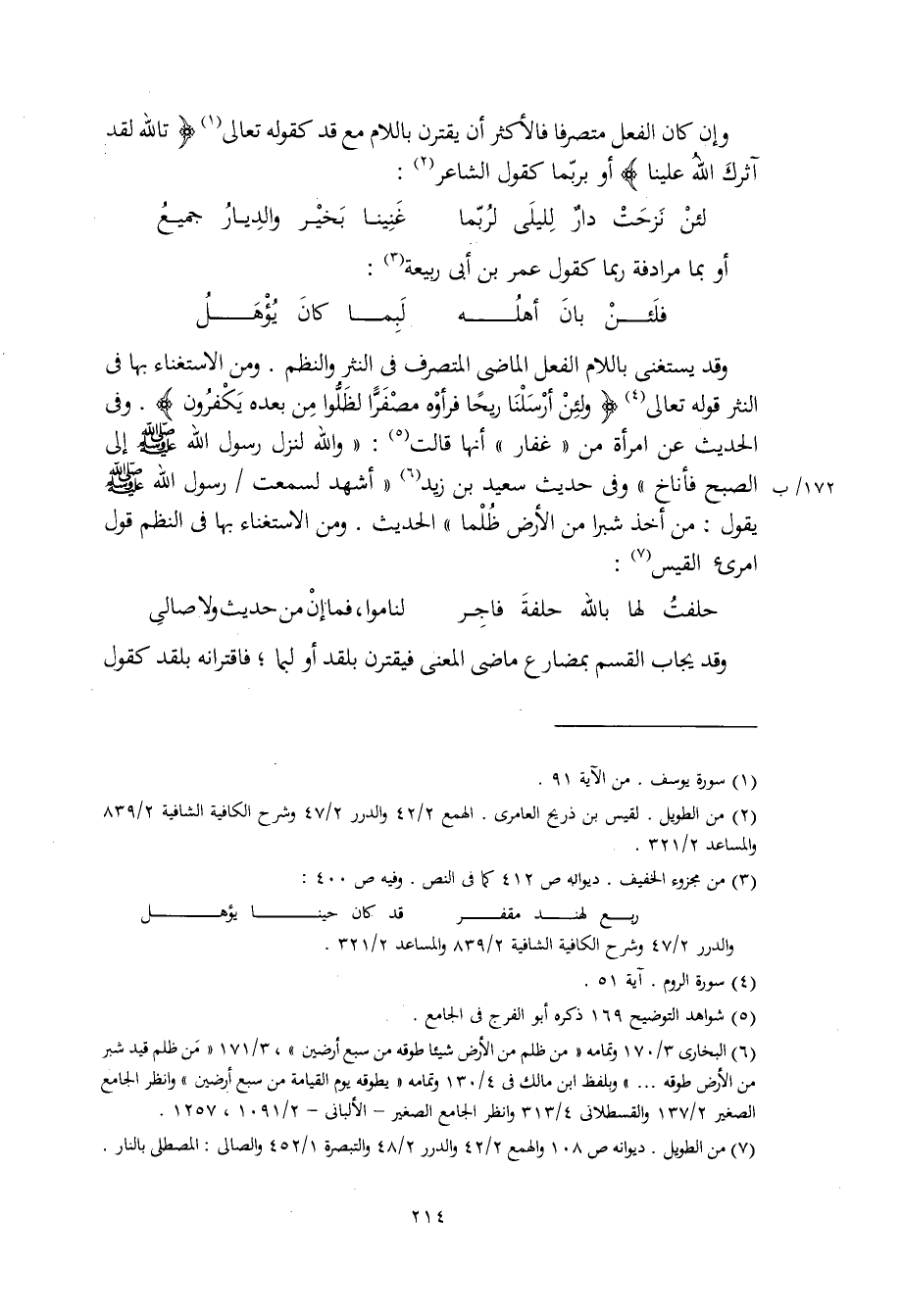وإن كان الفعل متصرفا فالأكثر أن يقترن باللام مع قد كقوله تعالى (تالله لقد آثرك الله علينا) أو بربّما كقول الشاعر: