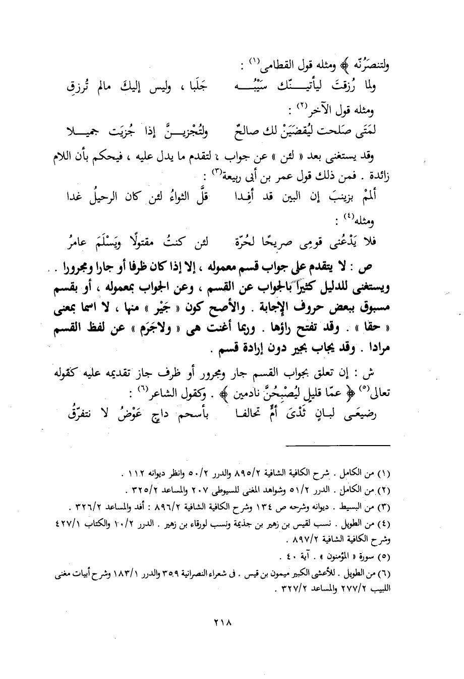 ش: إن تعلق بجواب القسم جار ومجرور أو ظرف جاز تقديمه عليه كقوله تعالى (عمّا قليلٍ ليُصْبحُنَّ نادمين). وكقول الشاعر: