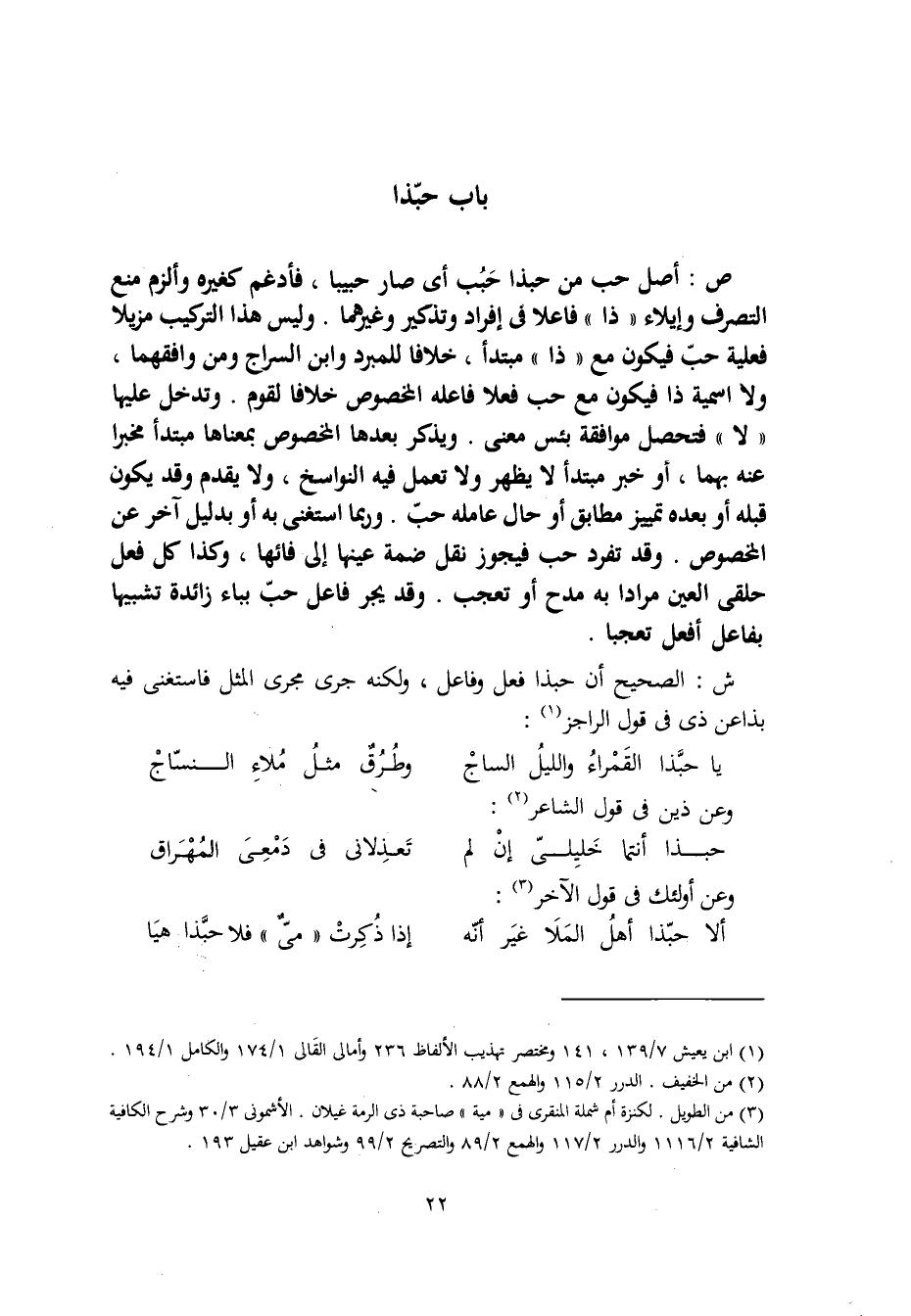 ص: أصل حب من حبذا حَبُب أي صار حبيبا، فأدغم كغيره وألزم منع التصرف وإيلاء "ذا" فاعلا في إفراد وتذكير وغيرهما. وليس هذا التركيب مزيلا فعلية حبّ فيكون مع "ذا" مبتدأ، خلافا للمبرد وابن السراج ومن وافقهما، ولا اسمية ذا فيكون مع حب فعلا فاعله المخصوص خلافا لقوم. وتدخل عليها "لا" فتحصل موافقة بئس معنى. ويذكر بعدها المخصوص بمعناها مبتدأ مخبرا عنه بهما، أو خبر مبتدأ لا يظهر ولا تعمل فيه النواسخ، ولا يقدم وقد يكون قبله أو بعده تمييز مطابق أو حال عامله حبّ. وربما استغنى به أو بدليل آخر عن المخصوص. وقد تفرد حب فيجوز نقل ضمة عينها إلى فائها، وكذا كل فعل حلقي العين مرادا به مدح أو تعجب. وقد يجر فاعل حبّ بباء زائدة تشبيها بفاعل أفعل تعجبا.