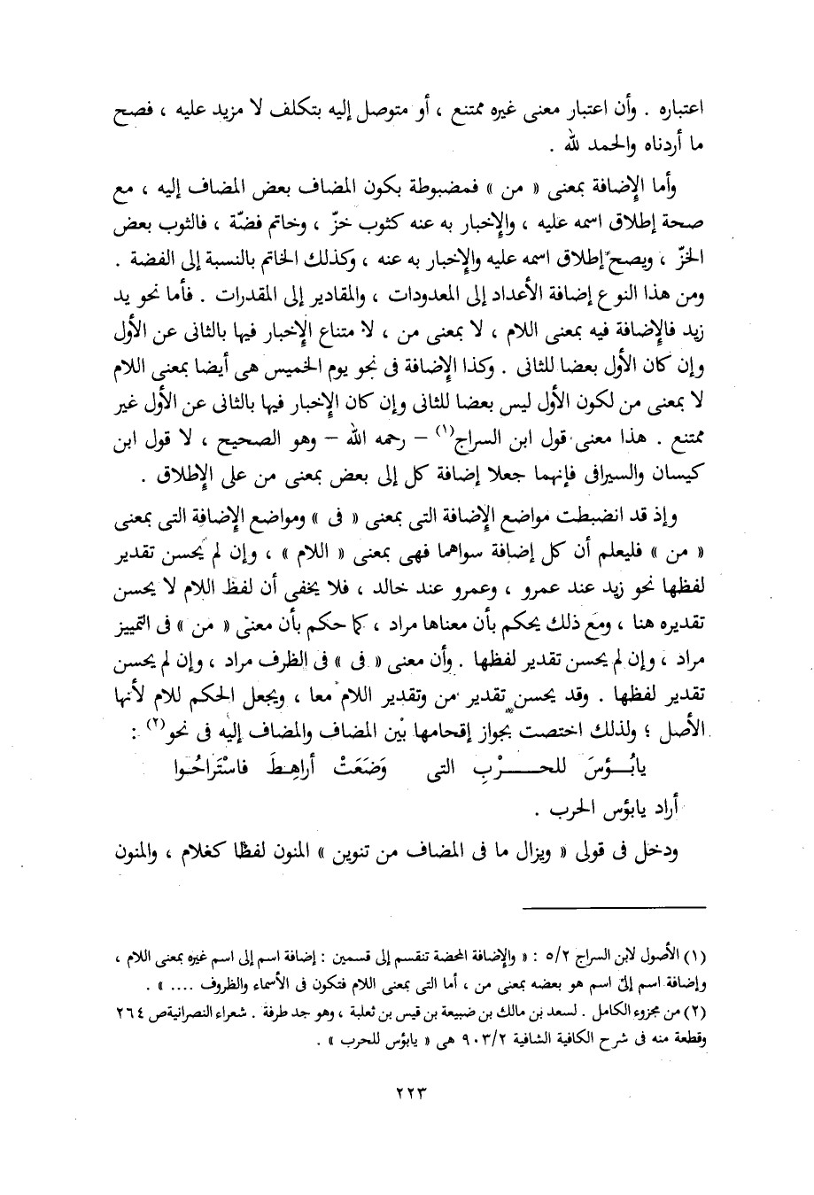وأما الإضافة بمعنى "من" فمضبوطة بكون المضاف بعض المضاف إليه، مع صحة إطلاق اسمه عليه، والإخبار به عنه كثوب خزّ، وخاتم فضّة، فالثوب بعض الخزّ، ويصح إطلاق اسمه عليه والإخبار به عنه، وكذلك الخاتم بالنسبة إلى الفضة. ومن هذا النوع إضافة الأعداد إلى المعدودات، والمقادير إلى المقدرات. فأما نحو يد زيد فالإضافة فيه بمعنى اللام، لا بمعنى من، لامتناع الإخبار فيها بالثاني عن الأول وإن كان الأول بعضا للثاني. وكذا الإضافة في نحو يوم الخميس هي أيضا بمعنى اللام لا بمعنى من لكون الأول ليس بعضا للثاني وإن كان الإخبار فيها بالثاني عن الأول غير ممتنع. هذا معنى قول ابن السراج – رحمه الله – وهو الصحيح، لا قول ابن كيسان والسيرافي فإنهما جعلا إضافة كل إلى بعض بمعنى من على الإطلاق.