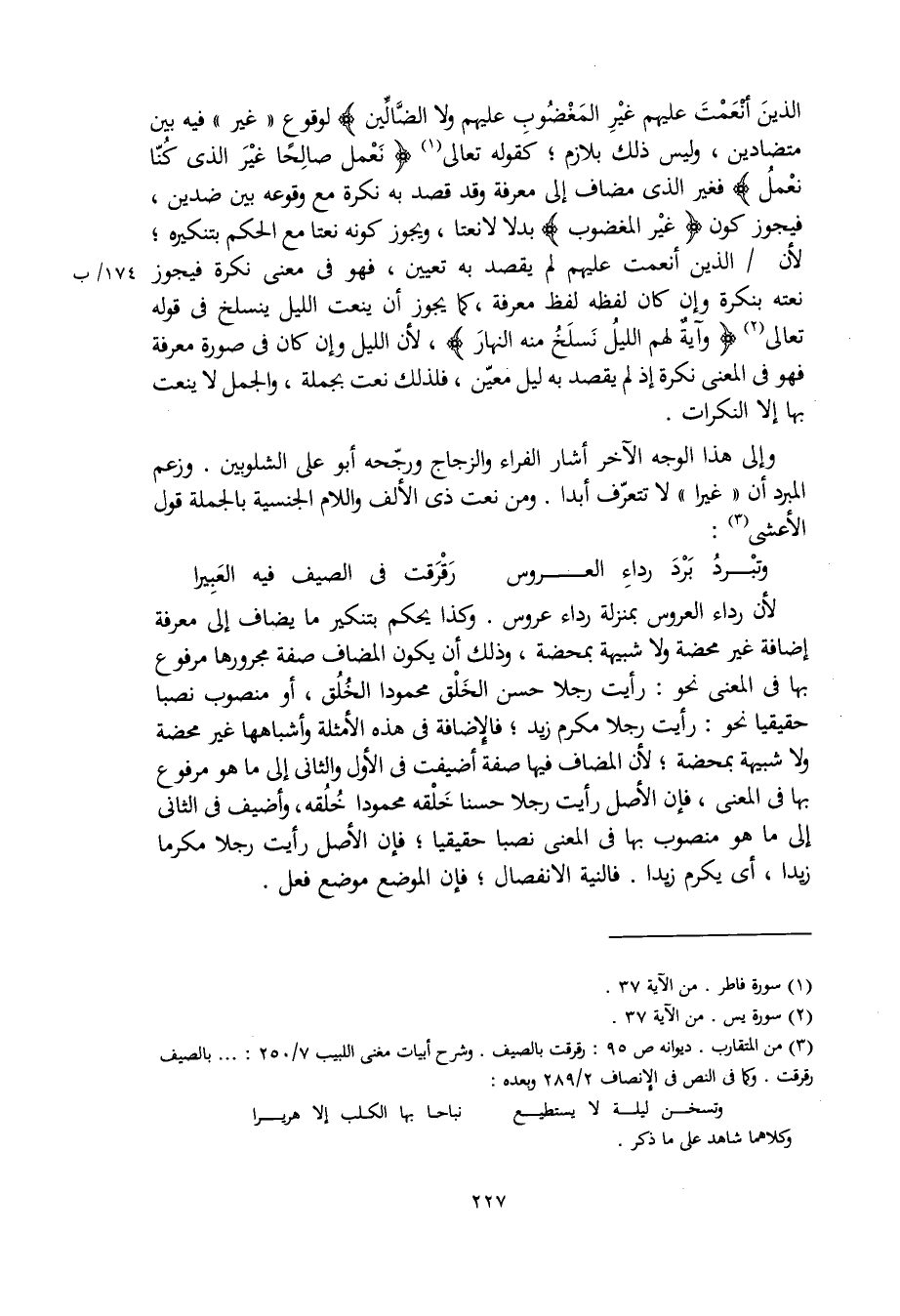 الذين أنعمتَ عليهم غير المغضوب عليهم ولا الضّالّين) لوقوع "غير" فيه بين متضادين، وليس ذلك بلازم، كقوله تعالى (نعمل صالحًا غيرَ الذي كُنّا نعملُ) فغير الذي مضاف إلى معرفة وقد قصد به نكرة مع وقوعه بي ضدين، فيجوز كون (غير المغضوب) بدلا لانعتا، ويجوز كونه نعتا مع الحكم بتنكيره، لأن الذين أنعمت عليهم لم يقصد به تعيين، فهو في معنى نكرة فيجوز نعته بنكرة وإن كان لفظه لفظ معرفة، كما يجوز أن ينعت الليل ينسلخ في قول تعالى (وآيةٌ لهم الليلُ نسلخُ منه النهارَ)، لأن الليل وإن كان في صورة معرفة فهو في المعنى نكرة إذ لم يقصد به ليل معيّن، فلذلك نعت بجملة، والجمل لا ينعت بها إلا النكرات.