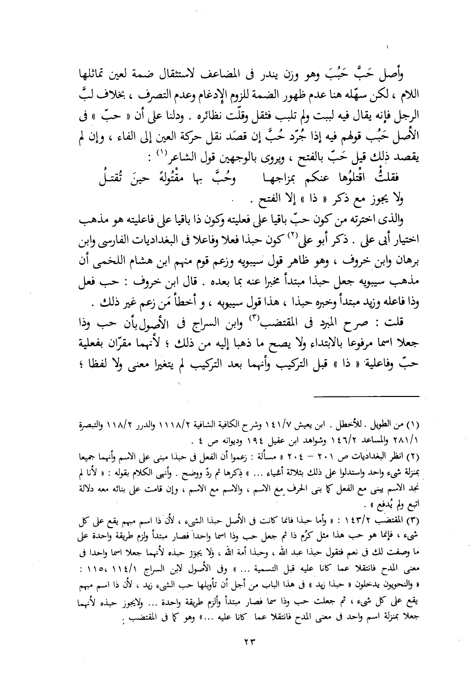 والذي اخترته من كون حبّ باقيا على فعليته وكون ذا باقيا على فاعليته هو مذهب اختيار أبي علي. ذكر أبو علي كون حبذا فعلا وفاعلا في البغداديات الفارسي وابن برهان وابن خروف، وهو ظاهر قول سيبويه وزعم قوم منهم ابن هشام اللخمي أن مذهب سيبويه جعل حبذا مبتدأ مخبرا عنه بما بعده. قال ابن خروف: حب فعل وذا فاعله وزيد مبتدأ وخبره حبذا، هذا قول سيبويه، وأخطأ من زعم غير ذلك.