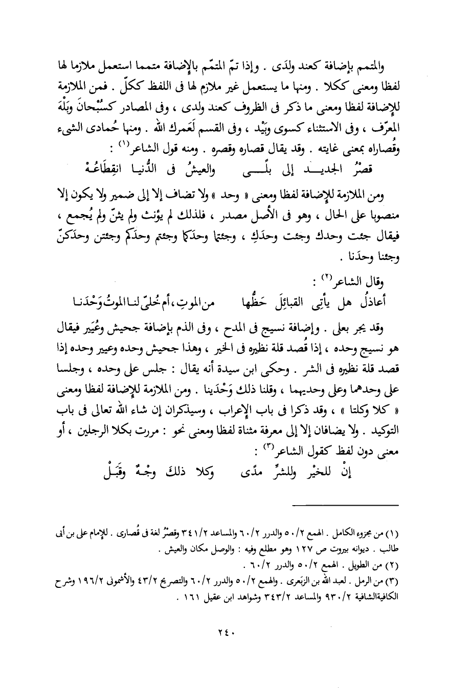 وقد يجر بعلى. وإضافة نسيج في المدح، وفي الذم بإضافة جحيش وعُيَير فيقال هو نسيج وحده، إذا قُصد قلة نظيره في الخير، وهذا جحيش وحده وعيير وحده إذا قصد قلة نظيره في الشر. وحكى ابن سيده أنه يقال: جلس على وحده، وجلسا على وحدهما وعلى وحديهما، وقلنا ذلك وَحْدَينا. ومن الملازمة للإضافة لفظا ومعنى "كلا وكلتا"، وقد ذكرا في باب الإعراب، وسيذكران إن شاء الله تعالى في باب التوكيد. ولا يضافان إلا إلى معرفة مثناة لفظا ومعنى نحو: مررت بكلا الرجلين، أو معنى دون لفظ كقول الشاعر: