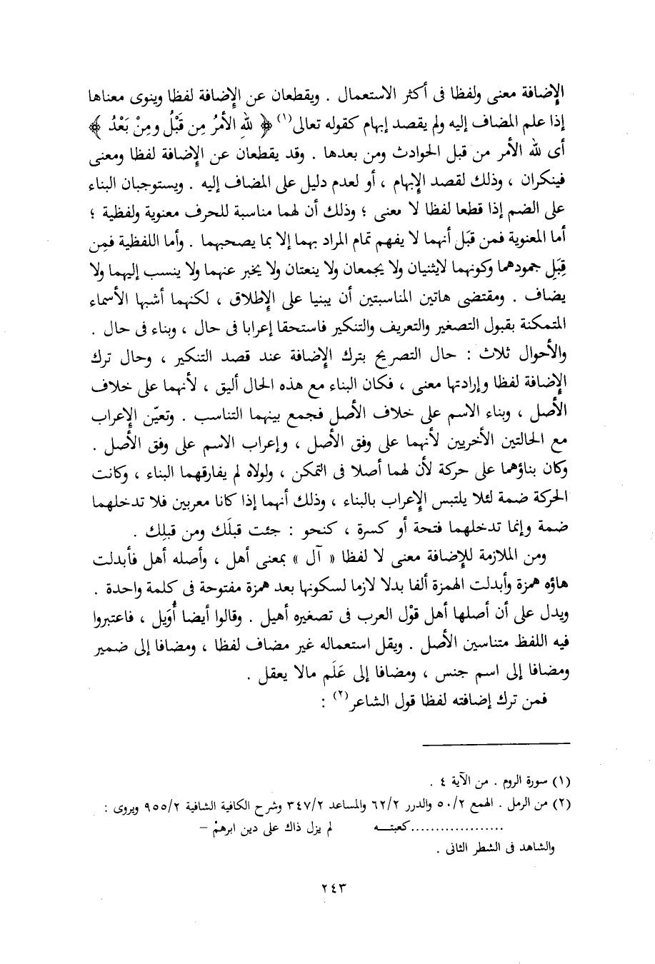 ومن الملازمة للإضافة معنى لا لفظا "آل" بمعنى أهل، وأصله أهل فأبدلت هاؤه همزة وأبدلت الهمزة ألفا بدلا لازما لسكونها بعد همزة مفتوحة في كلمة واحدة. ويدل على أن أصلها أهل قوْل العرب في تصغيره أهيل. وقالوا أيضا أُوَيل، فاعتبروا فيه اللفظ متناسين الأصل. ويقل استعماله غير مضاف لفظا، ومضافا إلى ضمير ومضافا إلى اسم جنس، ومضافا إلى عَلَم ما لا يعقل.
