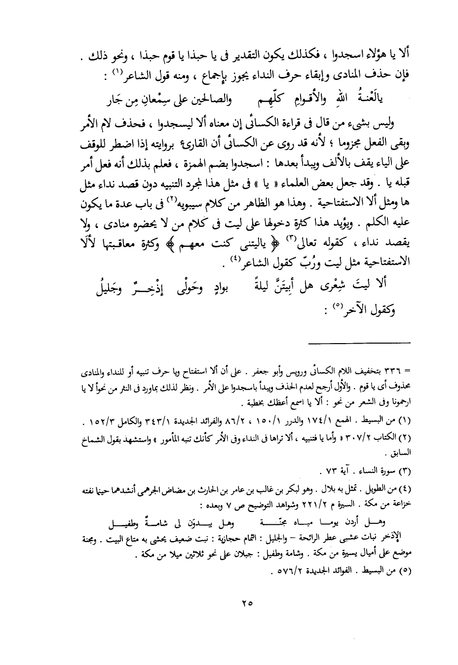 وليس بشيء من قال في قراءة الكسائي إن معناه ألا ليسجدوا، فحذف لام الأمر وبقي الفعل مجزوما، لأ، هـ قد روى عن الكسائي أن القارئ بروايته إذا اضطر للوقف على الياء يقف بالألف ويبدأ بعدها: اسجدوا بضم الهمزة، فعلم بذلك أنه فعل أمر قبله يا. وقد جعل بعض العلماء "يا" في مثل هذا لمجرد التنبيه دون قصد نداء مثل ها ومثل ألا الاستفتاحية. وهذا هو الظاهر من كلام سيبويه في باب عدة ما يكون عليه الكلم. ويؤيد هذا كثرة دخولها على ليت في كلام من لا يحضره منادى، ولا يقصد نداء، كقوله تعالى (يا ليتني كنت معهم) وكثرة معاقبتها لألا الاستفتاحية مثل ليت ورُبّ كقول الشاعر: