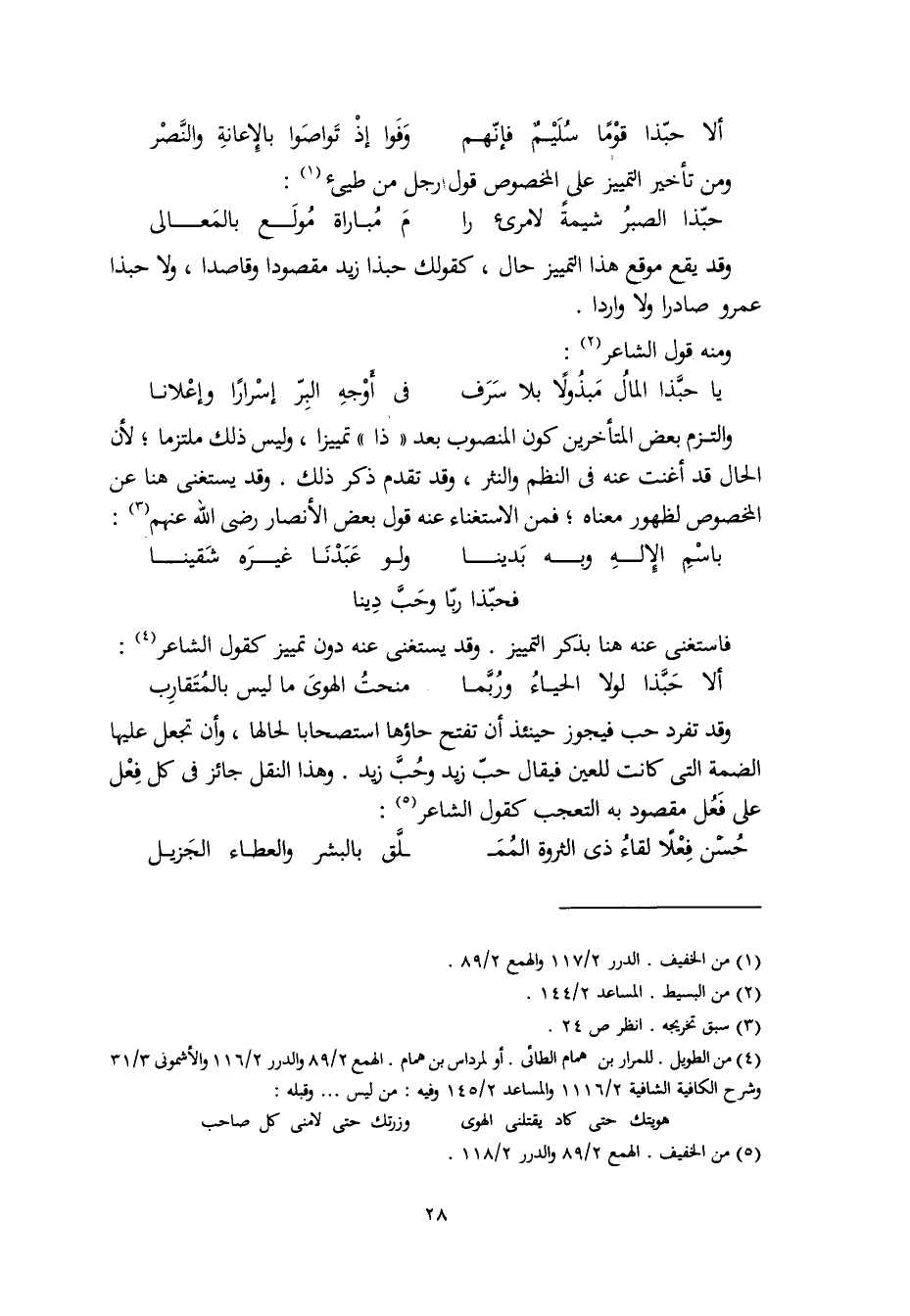 والتزم بعض المتأخرين كون المنصوب بعد "ذا" تمييزا، وليس ذلك ملتزما، لأن الحال قد أغنت عنه في النظم والنثر، وقد تقدم ذكر ذلك. وقد يستغنى هنا عن المخصوص لظهور معناه، فمن الاستغناء عنه قول بعض الأنصار رضي الله عنهم: