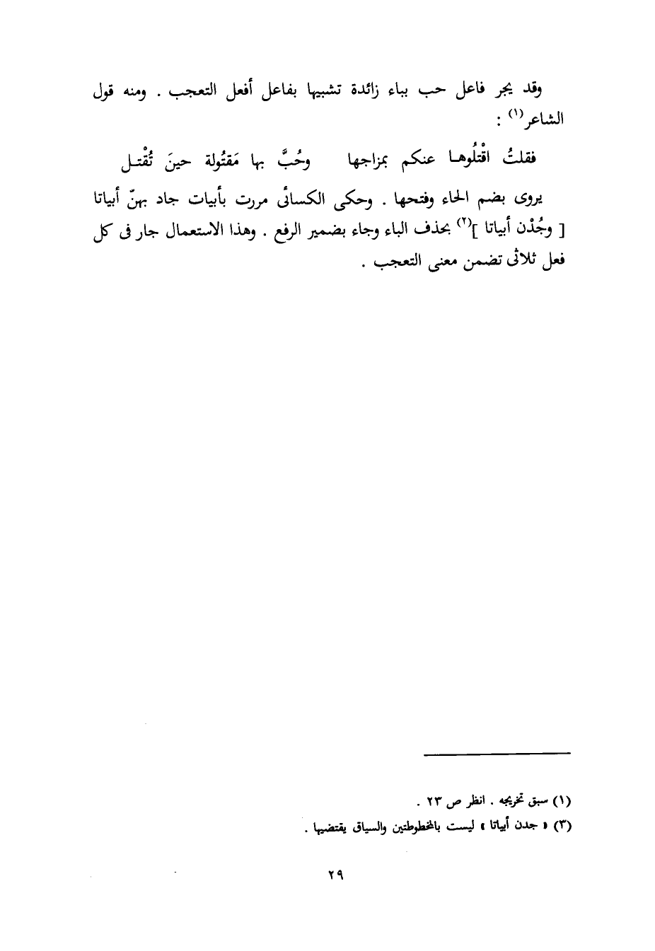 يروى بضم الحاء وفتحها. وحكى الكسائي مررت بأبيات جاد بهنّ أبياتا [وجُدْن أبياتا] بحذف الباء وجاء بضمير الرفع. وهذا الاستعمال جار في كل فعل ثلاثي تضمن معنى التعجب.