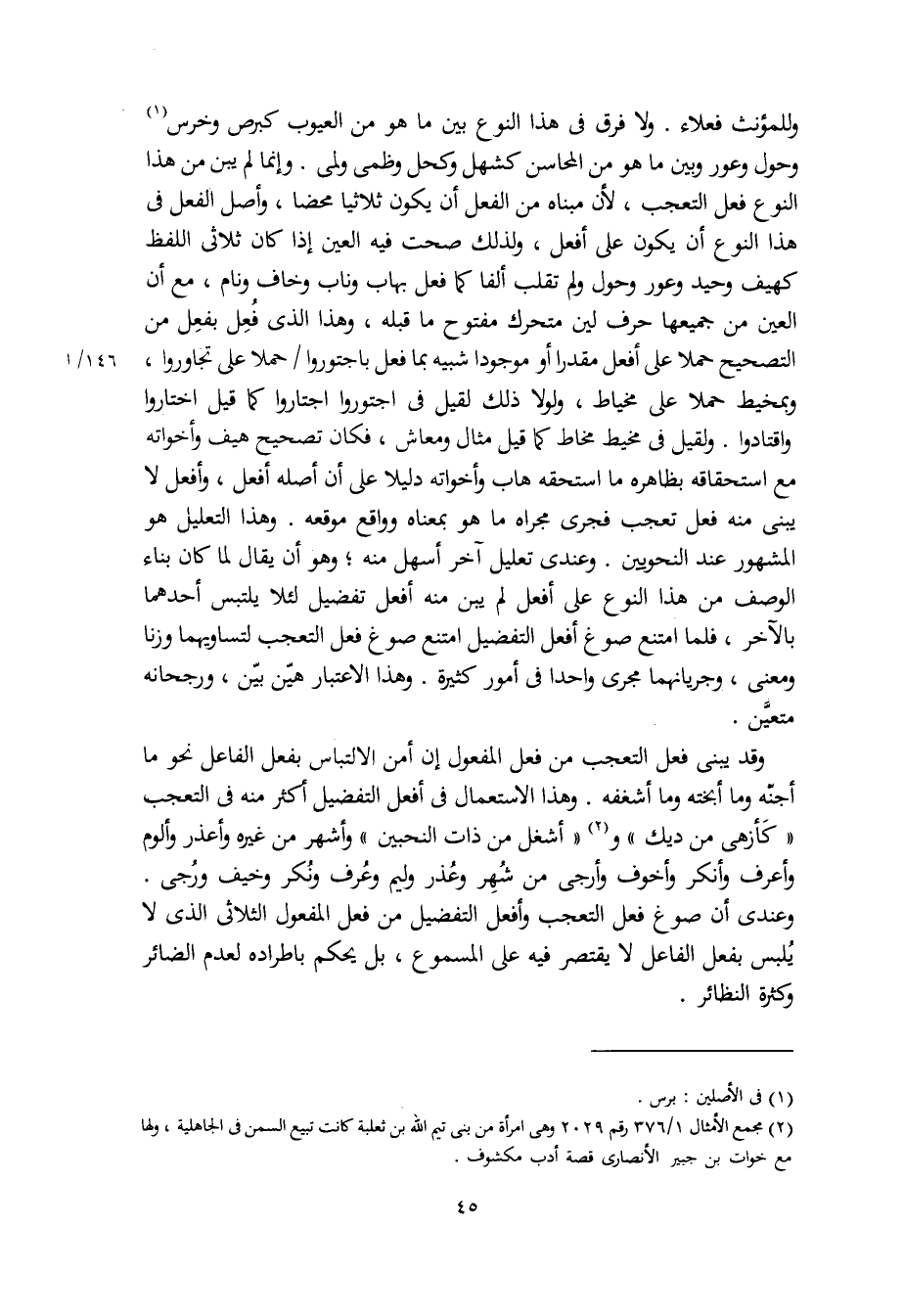 وللمؤنث فعلاء. ولا فرق في هذا النوع بين ما هو من العيوب كبرص وخرس وحول وعور وبين ما هو من المحاسن كشهل وكحل وظمي ولمي. وإنما لم يبن من هذا النوع فعل التعجب، لأن مبناه من الفعل أن يكون ثلاثيا محضا، وأصل الفعل في هذا النوع أن يكون على أفعل، ولذلك صحت فيه العين إذا كان ثلاثي اللفظ كهيف وحيد وعور وحول ولم تقلب ألفا كام فعل بهاب وناب وخاف ونام، مع أن العين من جميعها حرف لين متحرك مفتوح ما قبله، وهذا الذي فُعِل بفعِل من التصحيح حملا على أفعل مقدرا أو موجودا شبيه بما فعل باجتوروا حملا على تجاوروا، وبمخيط حملا على مخياط، ولولا ذلك لقيل في اجتوروا اجتاروا كما قيل اختاروا واقتادوا. ولقيل في مخيط مخاط كما قيل مثلا ومعاش، فكان تصحيح هيف وأخواته مع استحقاقه بظاهره ما استحقه هاب وأخواته دليلا على أن أصله أفعل، وأفعل لا يبنى منه فعل تعجب فجرى مجراه ما هو بمعناه وواقع موقعه. وهذا التعليل هو المشهور عند النحويين. وعندي تعليل آخر أسهل منه، وهو أن يقال لما كان بناء الوصف من هذا النوع على أفعل لم يبن منه أفعل تفضيل لئلا يلتبس أحدهما بالآخر، فلما امتنع صوغ أفعل التفضيل امتنع صوغ فعل التعجب لتساويهما وزنا ومعنى، وجريانهما مجرى واحدا في أمور كثيرة. وهذا الاعتبار هيّن بيّن، ورجحانه متعيّن.