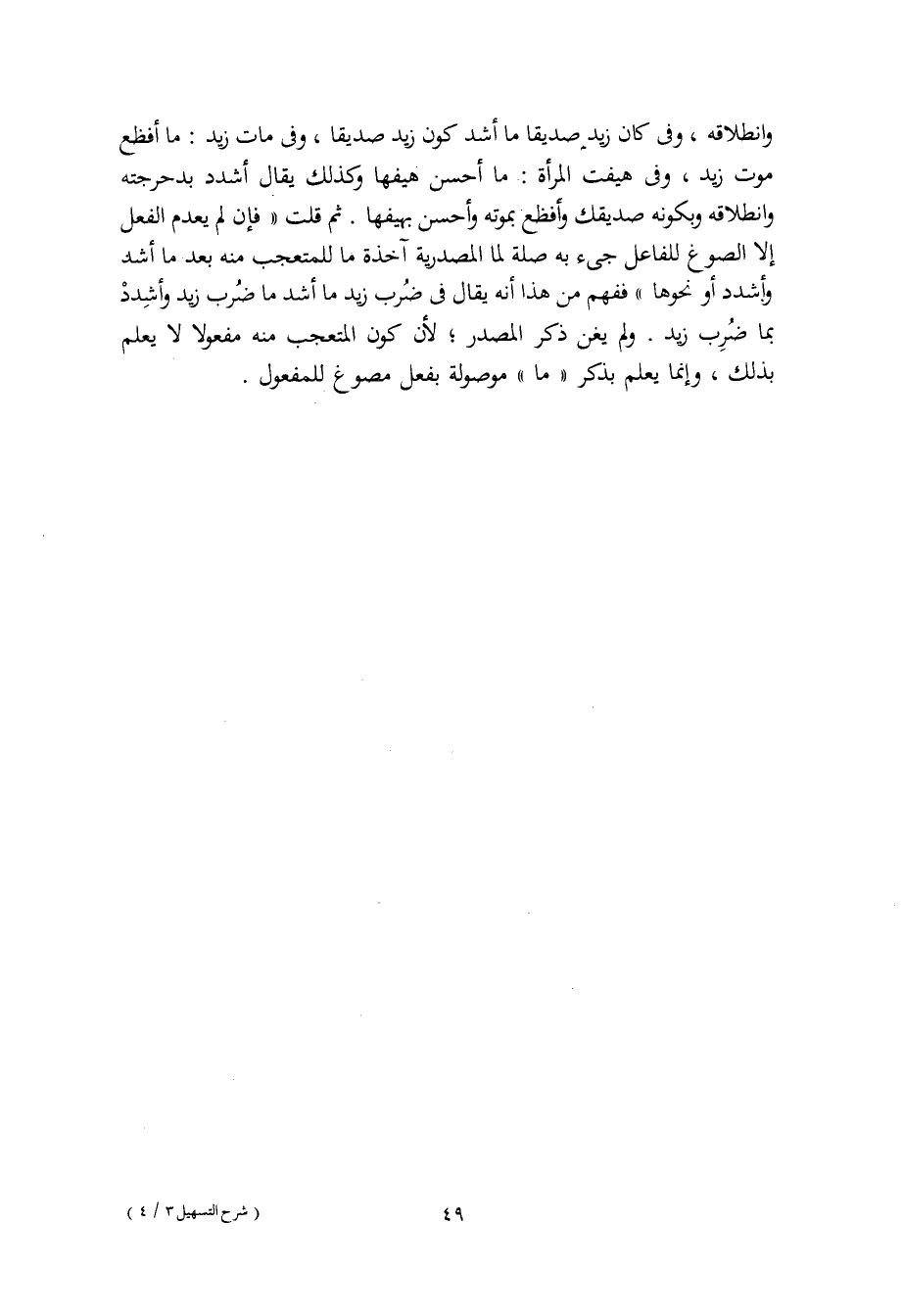وانطلاقه، وفي كان زيد صديقا ما أشد كون زيد صديقا، وفي مات زيد: ما أفظع موت زيد، وفي هيفت المرأة: ما أحسن هيفها وكذلك يقال أشدد بدحرجته وانطلاقه وبكونه صديقك وأفظع بموته وأحسن بهيفها. ثم قلت "فإن لم يعدم الفعل إلا الصوغ للفاعل جيء به صلة لما المصدرية آخذة ما للمتعجب منه بعد ما أشد وأشدد أو نحوها " ففهم من هذا أنه يقال في ضرُب زيد ما أشد ما ضُرب زيد وأشدِدْ بما ضُرِب زيد. ولم يغن ذكر المصدر، لأن كون المتعجب منه مفعولا لا يعلم بذلك، وإنما يعلم بذكر "ما" موصولة بفعل مصوغ للمفعول.