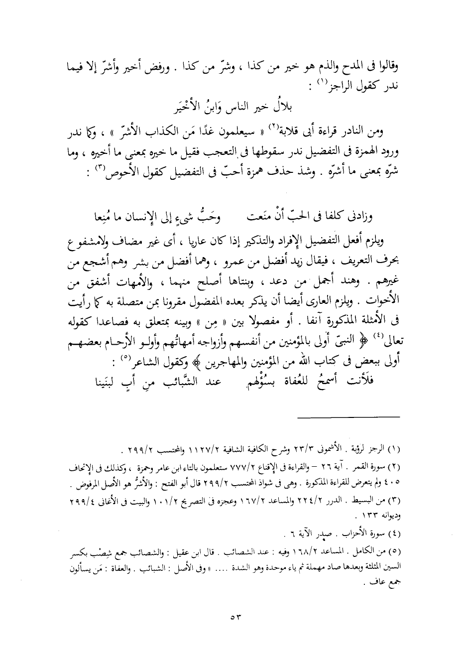 ومن النادر قراءة أبي قلابة "سيعلمون غدًا من الكذاب الأشرّ"، وكما ندر ورود الهمزة في التفضيل ندر سقوطها في التعجب فقيل ما خيره بمعنى ما أخيره، وما شرّه بمعنى ما أشرّه. وشذ حذف همزة أحبّ في التفضيل كقول الأحوص: