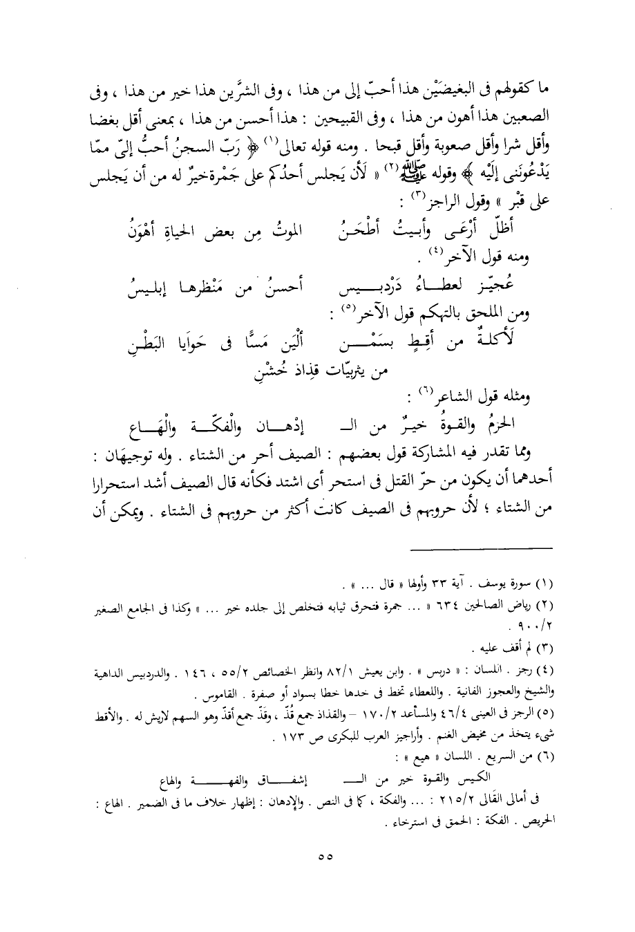 ما كقولهم في البغيضَيْن هذا أحبّ إلي من هذا، وفي الشرَّين هذا خير من هذا، وفي الصعبين هذا أهون من هذا، وفي القبيحين: هذا أحسن من هذا، بمعنى أقل بعضا وأقل شرا وأقل صعوبة وأقل قبحا. ومنه قوله تعالى: (ربّ السجنُ أحبُّ إليّ ممّا يدعونني إليه) وقوله صلى الله عليه وسلم: "لأن يجلس أحدكم على جمرة خيرٌ له من أن يجلس على قبر" وقول الراجز: