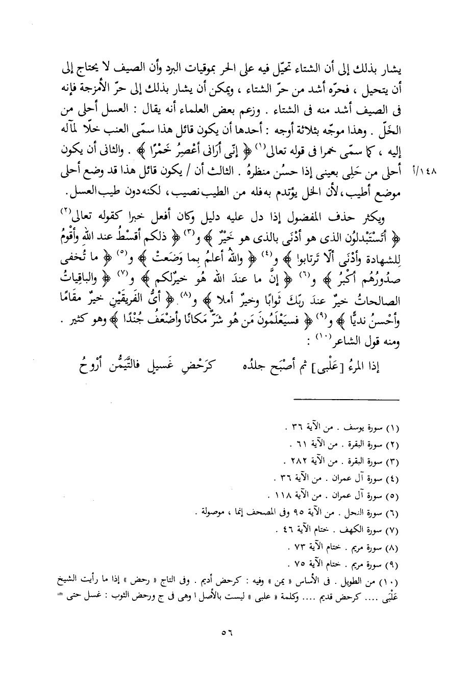 يشار بذلك إلى أن الشتاء تحيّل فيه على الحر بموقيات البرد وأن الصيف لا يحتاج إلى أن يتحيل، فحرّه أشد من حرّ الشتاء، ويمكن أن يشار بذلك إلى حرّ الأمزجة فإنه في الصيف أشد منه في الشتاء. وزعم بعض العلماء أنه يقال: العسل أحلى من الخلّ. وهذا موجّه بثلاثة أوجه: أحدها أن يكون قائل هذا سمّى العنب خلّا لمآله إليه، كما سمّي خمرا في قوله تعالى: (إنّي أراني أعصر خمرا). والثاني أن يكون أحلى من حَلِي بعيني إذا حسُن منظره. الثالث أن يكون قائل هذا قد وضع أحلى موضع أطيب، لأن الخل يؤتدم به فله من الطيب نصيب، لكنه دون طيب العسل.