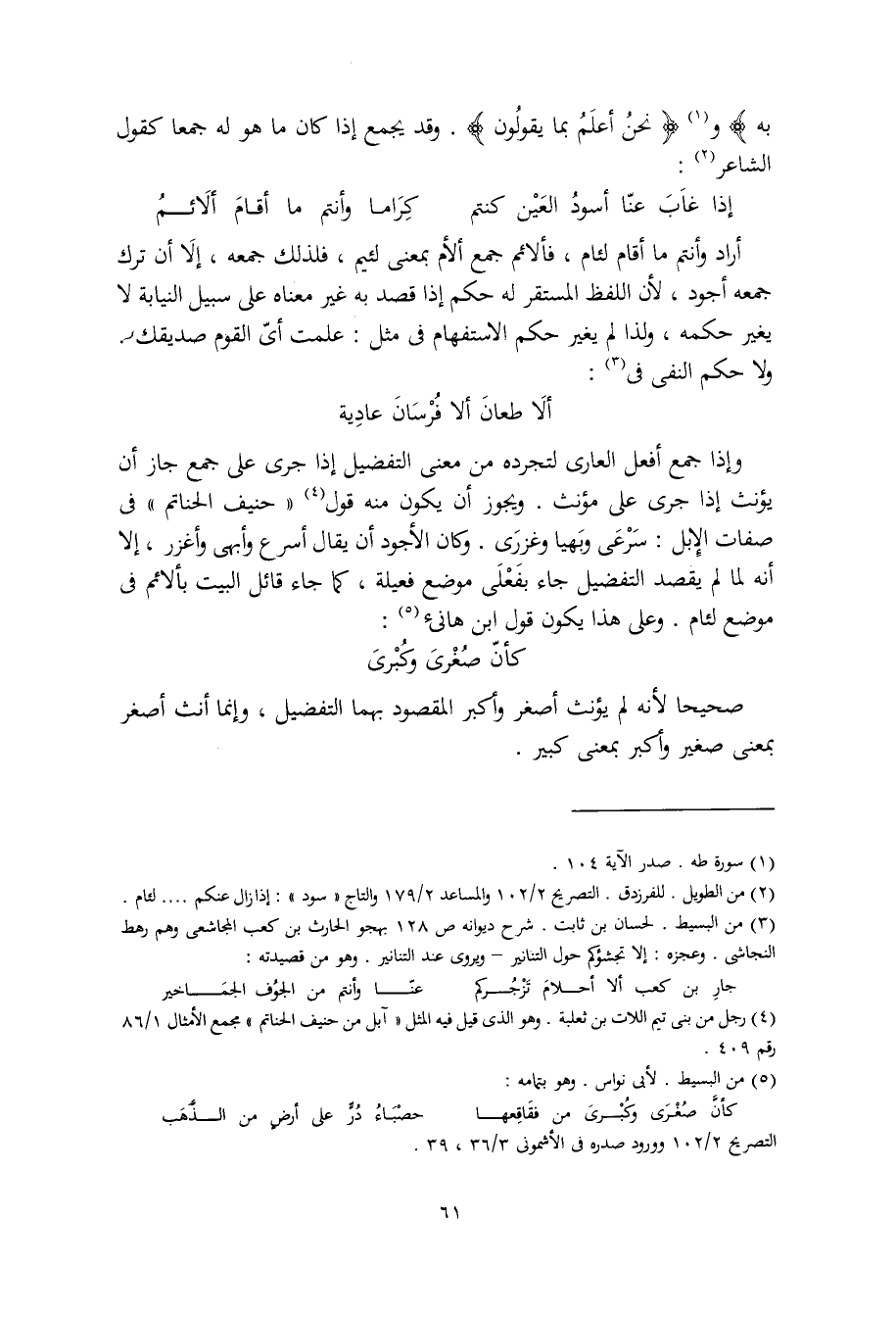 وإذا جمع أفعل العاري لتجرده من معنى التفضيل إذا جرى على جمع جاز أن يؤنث إذا جرى على مؤنث. ويجوز أن يكون منه قول "حنيف الحناتم" في صفات الإبل: سَرْعى وبَهيا وغزرى. وكان الأجود أن يقال أسرع وأبهى وأغزر، إلا أنه لما لم يقصد التفضيل جاء بفَعْلى موضع فعيلة، كما جاء قائل البيت بألائم في موضع لئام. وعلى هذا يكون قول ابن هانئ: كأنّ صُغْريَ وكُبْرى