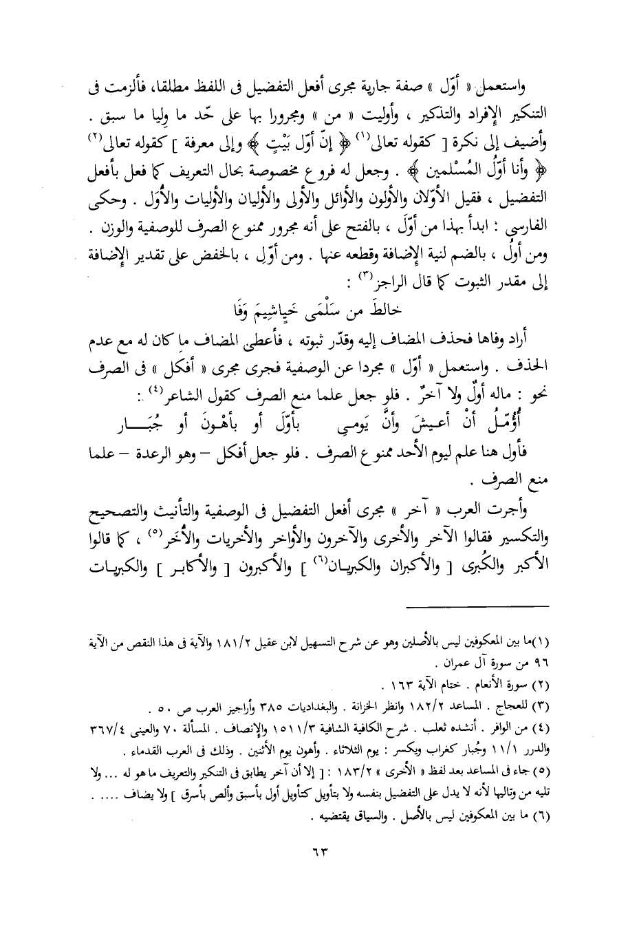 واستعمل "أوّل" صفة جارية مجرى أفعل التفضيل في اللفظ مطلقا، فألزمت في التنكير الإفراد والتذكير، وأوليت "من" ومجرورا بها على حدّ ما وليا ما سبق. وأضيف إلى نكرة [كقوله تعالى (إنّ أوّل بيتٍ) وإلى معرفة] كقوله تعالى: (وأنا أوّلُ المسلمين). وجعل له فروع مخصوصة بحال التعريف كما فعل بأفعل التفضيل، فقيل الأوّلان والأولون والأوائل والأولى والأوليان والأوليات والأُوَل. وحكى الفارسي: ابدأ بهذا من أوّلَ، بالفتح على أنه مجرور ممنوع الصرف للوصفية والوزن.