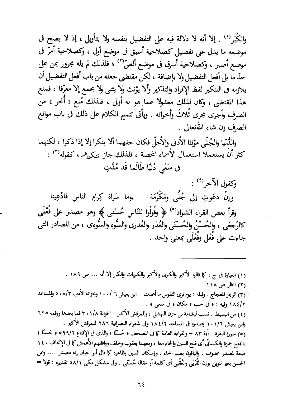 والكُبَر. إلا أنه لا دلالة فيه على التفضيل بنفسه ولا بتأويل، إذ لا يصح في موضعه ما يدل على تفضيل كصلاحية أسبق في موضع أول، وكصلاحية أمرّ في موضع أصبر، وكصلاحية أسرق في موضع ألصّ؛ فلذلك لم يله مجرور بمن على حدّ ما يلي أفعل التفضيل ولا بإضافة، لكن مقتضى جعله من باب أفعل التفضيل أن يلازمه في التنكير لفظ الإفراد والتذكير وألا يؤنث ولا يثنى ولا يجمع إلا معرّفا، فمنع هذا المقتضى، وكان لذلك معدولا عما هو به أولى، فلذلك مُنع "أُخَر" من الصرف وأجرى مجرى ثُلاثَ وأخواته. ويأتي تتميم الكلام على ذلك في باب موانع الصرف إن شاء الله تعالى.
