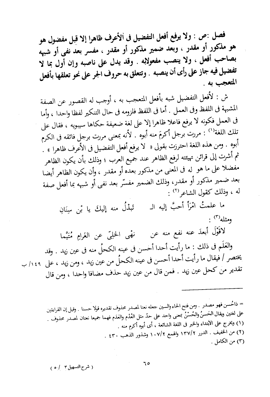 ش: لأفعل التفضيل شبه بأفعل المتعجب به، أوجب له القصور عن الصفة المشبهة في اللفظ وفي العمل، أما في اللفظ فلزومه في حال التنكير لفظا واحدا، وأما في العمل فكونه لا يرفع فاعلا ظاهرا إلا على لغة ضعيفة حكاها سيبويه، فقال على تلك اللغة: مررت برجل أكرمَ منه أبوه، لأنه بمعنى مررت برجل فائقه في الكرم أبوه. ومن هذه اللغة احترزت بقولي "لا يرفع أفعل التفضيل في الأعرف ظاهرا". ثم أشرت إلى قرائن تهيئته لرفع الظاهر عند جميع العرب، وذلك بأن يكون الظاهر مفضلا على ما هو له في المعنى من مذكور بعده أو مقدر، وأن يكون الظاهر أيضا بعد ضمير مذكور أو مقدر، وذلك الضمير مفسّر بعد نفي أو شبهه بما أفعل صفة له، وذلك كقول الشاعر: