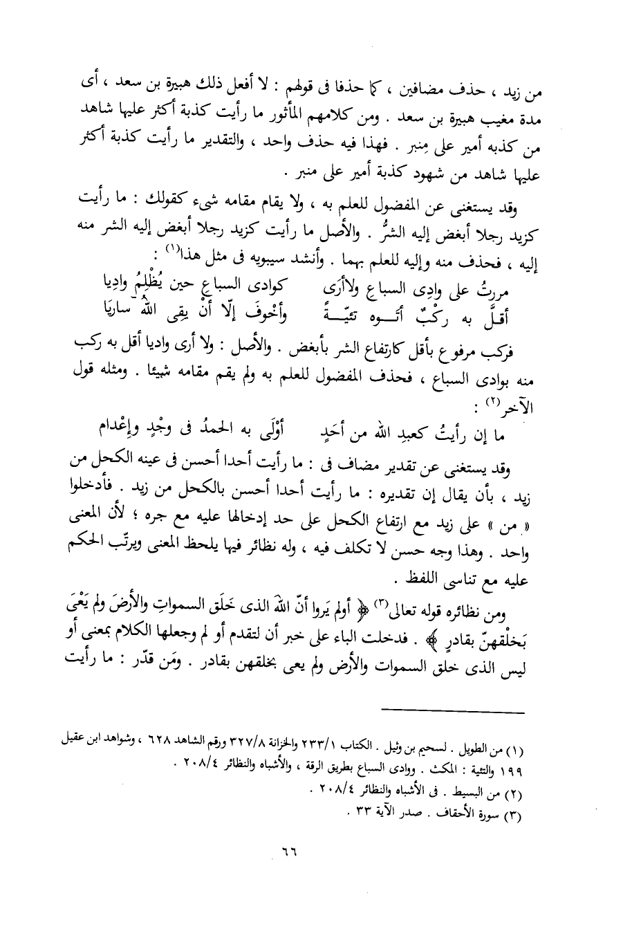 ومن نظائره قوله تعالى: (أولم يَروا أنّ اللهَ الذي خلق السمواتِ والأرضَ ولم يعيَ بخلقهنّ بقادرٍ). فدخلت الباء على خبر أن لتقدم أو لم وجعلها الكلام بمعنى أو ليس الذي خلق السموات والأرض ولم يعي بخلقهن بقادر. ومَن قدّر: ما رأيت