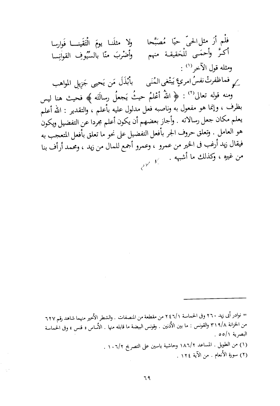 ومنه قوله تعالى: (اللهُ أعلمُ حيثُ يجعلُ رسالتَه) فحيث هنا ليس بظرف، وإنما هو مفعول به وناصبه فعل مدلول عليه بأعلم، والتقدير: الله أعلم يعلم مكان جعل رسالاته. وأجاز بعضهم أن يكون أعلم مجردا عن التفضيل ويكون هو العامل. وتعلق حروف الجر بأفعل التفضيل على نحو ما تعلق بأفعل التمعجب به فيقال زيد أرغب في الخير من عمرو، وعمرو أجمع للمال من زيد، ومحمد أرأف بنا من غيره، وكذلك ما أشبهه.