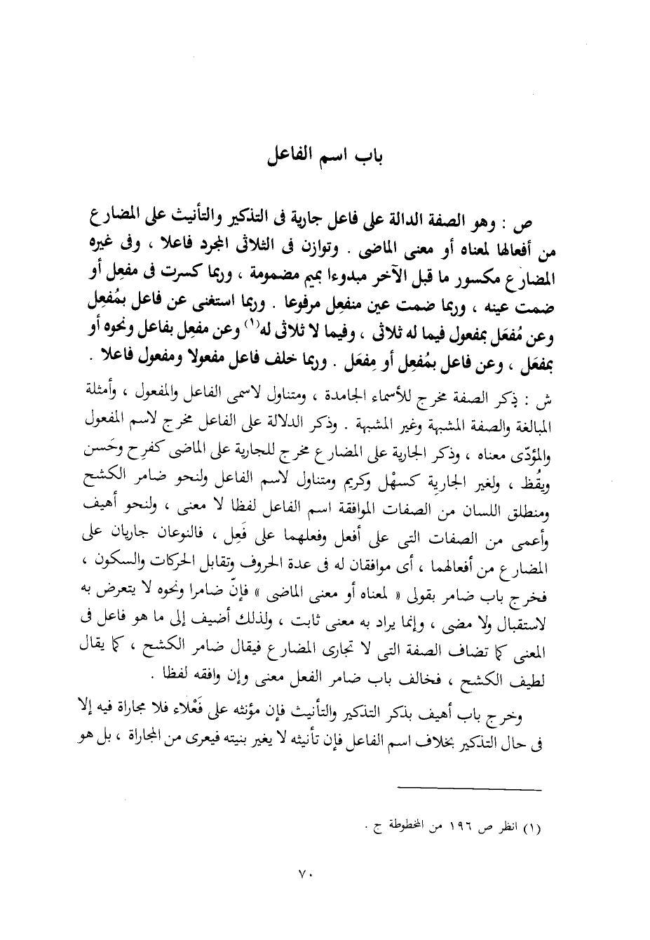 ش: ذكر الصفة مخرج للأسماء الجامدة، ومتناول لاسمي الفاعل والمفعول، وأمثلة المبالغة والصفة المشبهة وغير المشبهة. وذكر الدلالة على الفاعل مخرج لاسم المفعول والمؤدّي معناه، وذكر الجارية على المضارع مخرج للجارية على الماضي كفرِح وحَسن ويقُظ، ولغير الجاريةِ كسهْل وكريم ومتناول لاسم الفاعل ولنحو ضامر الكشح ومنطلق اللسان من الصفات الموافقة اسم الفاعل لفظا لا معنى، ولنحو أهيف وأعمى من الصفات التي على أفعل وفعلهما على فَعِل، فالنوعان جاريان على المضارع من أفعالهما، أي موافقان له في عدة الحروف وتقابل الحركات والسكون، فخرج باب ضامر بقولي "لمعناه أو معنى الماضي" فإنّ ضامرا ونحوه لا يتعرض به لاستقبال ولا مضي، وإنما يراد به معنى ثابت، ولذلك أضيف إلى ما هو فاعل في المعنى كما تضاف الصفة التي لا تجاري المضارع فيقال ضامر الكشح، كما يقال لطيف الكشح، فخالف باب ضامر الفعل معنى وإن وافقه لفظا.