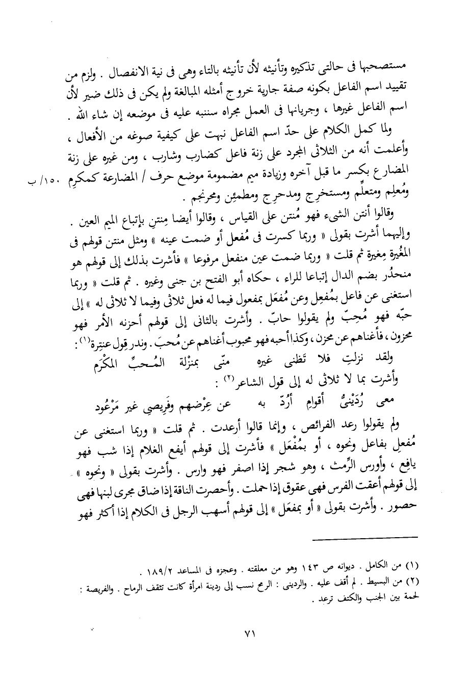 وإليهما أشرت بقولي "وربما كسرت في مُفعل أو ضمت عينه" ومثل منتن قولهم في المُغيرة مِغيرة ثم قلت "وربما ضمت عين منفعل مرفوعا" فأشرت بذلك إلى قولهم هو منحدُر بضم الدال إتباعا للراء، حكاه أبو الفتح بن جني وغيره. ثم قلت "وربما استغني عن فاعل بمُفعِل وعن مُفعَل بمفعول فيما له فعل ثلاثي وفيما لا ثلاثي له" إلى حبّه فهو مُحِبّ ولم يقولوا حابّ. وأشرت بالثاني إلى قولهم أحزنه الأمر فهو محزون، فأغناهم عن محزن، وكذا أحبه فهو محبوب أغناهم عن مُحَب. وندر قول عنترة: