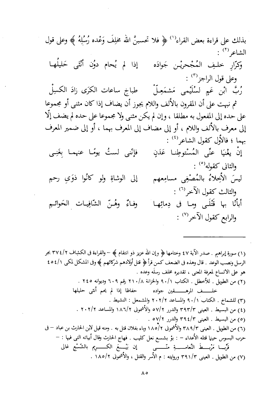 بذلك على قراءة بعض القراء (فلا تحسبنَّ الله مخلفَ وعده رُسُلِه) وعلى قول الشاعر: