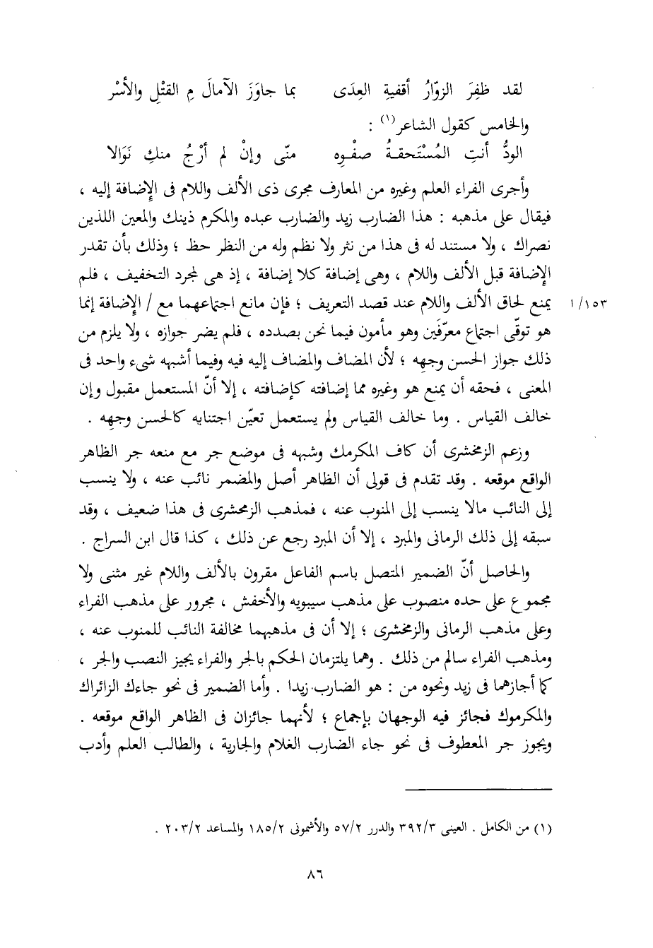 والحاص أنّ الضمير المتصل باسم الفاعل مقرون بالألف واللام غير مثنى ولا مجموع على حده منصوب على مذهب سيبويه والأخفش، مجرور على مذهب الفراء وعلى مذهب الرماني والزمخشري، إلا أن في مذهبهما مخالفة النائب للمنوب عنه، ومذهب الفراء سالم من ذلك. وهما يلتزمان الحكم بالجر والفراء يجيز النصب والجر، كما أجازهما في زيد ونحوه من: هو الضارب زيدا. وأما الضمير في نحو جاءك الزائراك والمكرموك فجائز فيه الوجهان بإجماع، لأنهما جائزان في الظاهر الواقع موقعه. ويجوز جر المعطوف في نحو جاء الضارب الغلام والجارية، والطالب العلم وأدب