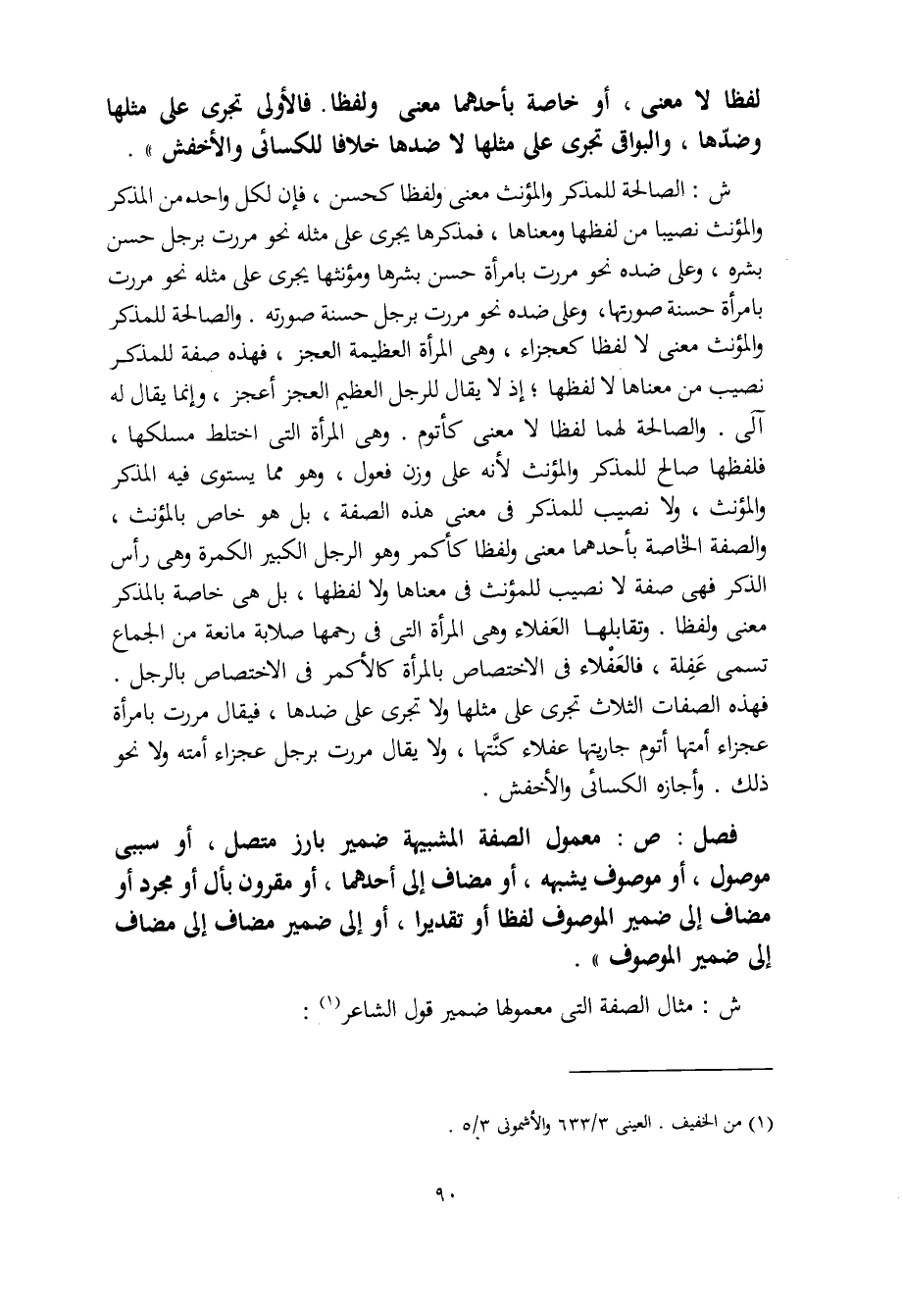 ش: الصالحة للمذكر والمؤنث معنى ولفظا كحسن، فإن لكل واحد من المذكر والمؤنث نصيبا من لفظها ومعناها، فمذكرها يجرى على مثله نحو مررت برجل حسن بشره، وعلى ضده نحو مررت بامرأة حسن بشرها ومؤنثها يجرى على مثله نحو مررت بامرأة حسنة صورتها، وعلى ضده نحو مررت برجل حسنة صورته. والصالحة للمذكر والمؤنث معنى لا لفظا كعجزاء، وهي المرأة العظيمة العجز، فهذه صفة للمذكر نصيب من معناها لا لفظها، إذ لا يقال للرجل العظيم العجز أعجز، وإنما يقال له آلى. والصالحة لهما لفظا لا معنى كأتوم، وهي المرأة التي اختلط مسلكها، فلفظها صالح للمذكر والمؤنث، ولا نصيب للمذكر في معنى هذه الصفة، بل هو خاص بالمؤنث، والصفة الخاصة بأحدهما معنى ولفظا كأكمر وهو الرجل الكبير الكمرة وهي رأس الذكر فهي صفة لا نصيب للمؤنث في معناها ولا لفظها، بل هي خاصة بالمذكر معنى ولفظا. وتقابلها العَفلاء وهي المرأة التي في رحمها صلابة مانعة من الجماع تسمى عَفِلة، فالعَفْلاء في الاختصاص بالمرأة كالأكمر في الاختصاص بالرجل.