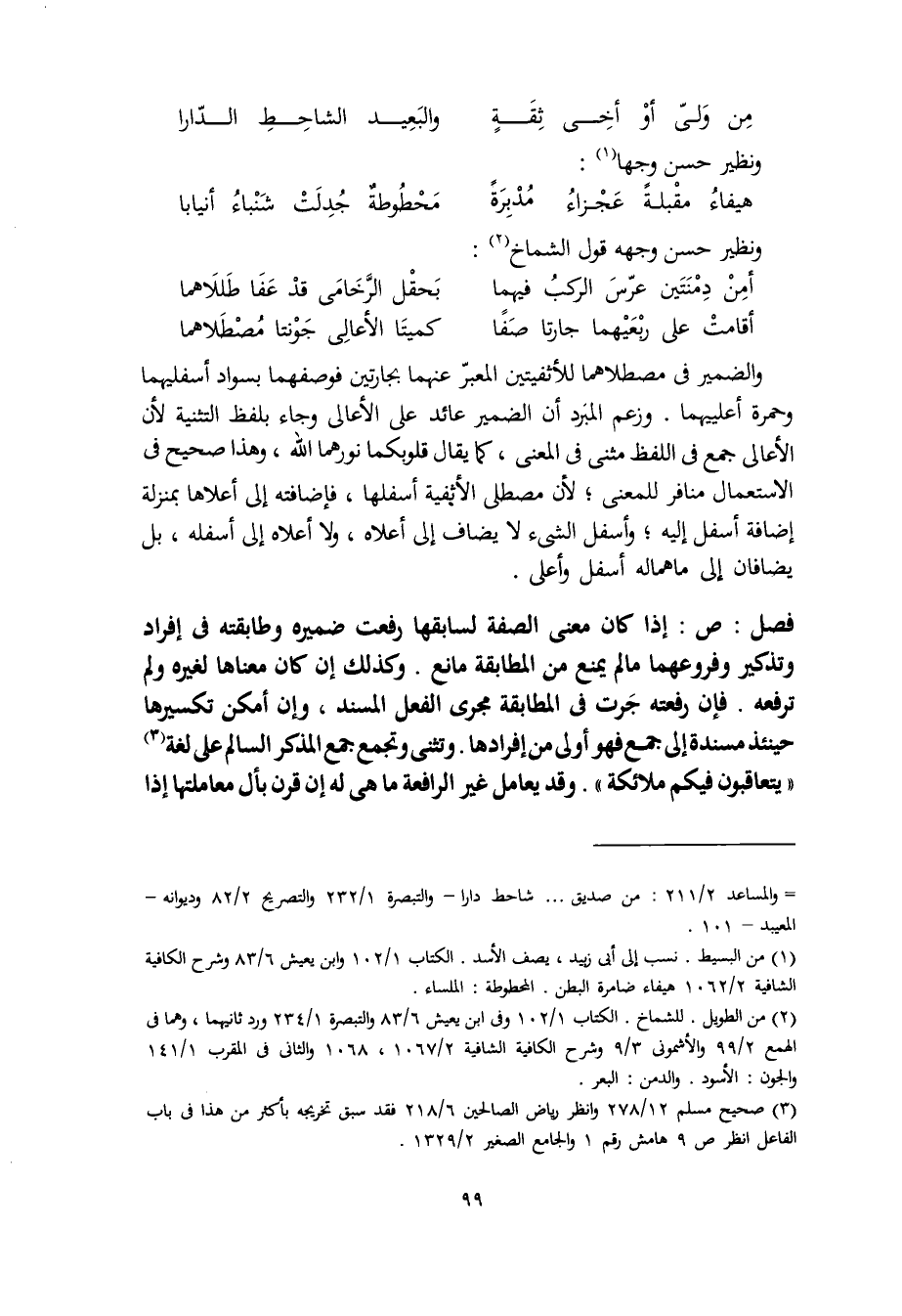 فصل: ص: إذا كان معنى الصفة لسابقها رفعت ضميره وطابقته في إفراد وتذير وفروعهما ما لم يمنع من المطابقة مانع. وكذلك إن كان معناها لغيره ولم ترفعه. فإن رفعته جَرت في المطابقة مجرى الفعل المسند، وإن أمكن تكسيرها حينئذ مسندة إلى جمع فهو أولى من إفرادها. وتثنى وتجمع جمع المذكر السالم على لغة "يتعاقبون فيكم ملائكة". وقد يعامل غير الرافعة ما هي له إن قرن بأل معاملتها إذا