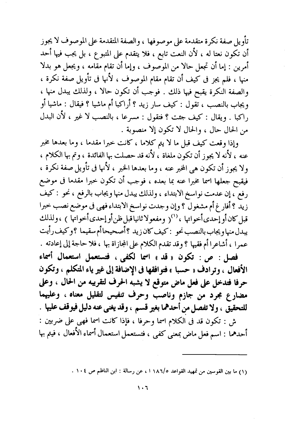 تأويل صفة نكرة متقدمة على موصوفها، والصفة المتقدمة على الموصوف لا يجوز أن تكون نعتا له، لأن النعت تابع، فلا يتقدم على المتبوع، بل يجب فيها أحد أمرين: إما أن تجعل حالا من الموصوف، وإما أن تقام مقامه، ويجعل هو بدلا منها، فلم يجز في كيف أن تقام مقام الموصوف، لأنها في تأويل صفة نكرة، والصفة النكرة يقبح فيها ذلك. فوجب أن تكون حالا، ولذلك يبدل منها، ويجاب بالنصب، تقول: كيف سار زيد؟ أراكبا أم ماشيا؟ فيقال: ماشيا أو راكبا. ويقال: كيف جئت؟ فتقول: مسرعا، بالنصب لا غير، لأن البدل من الحال حال، والحال لا تكون إلا منصوبة.