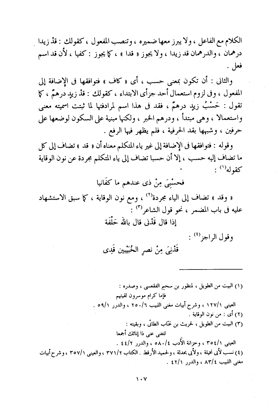 "وقد" تضاف إلى الياء مجردة، ومع نون الوقاية، كما سبق الاستشهاد عليه في باب المضمر، نحو قول الشاعر: