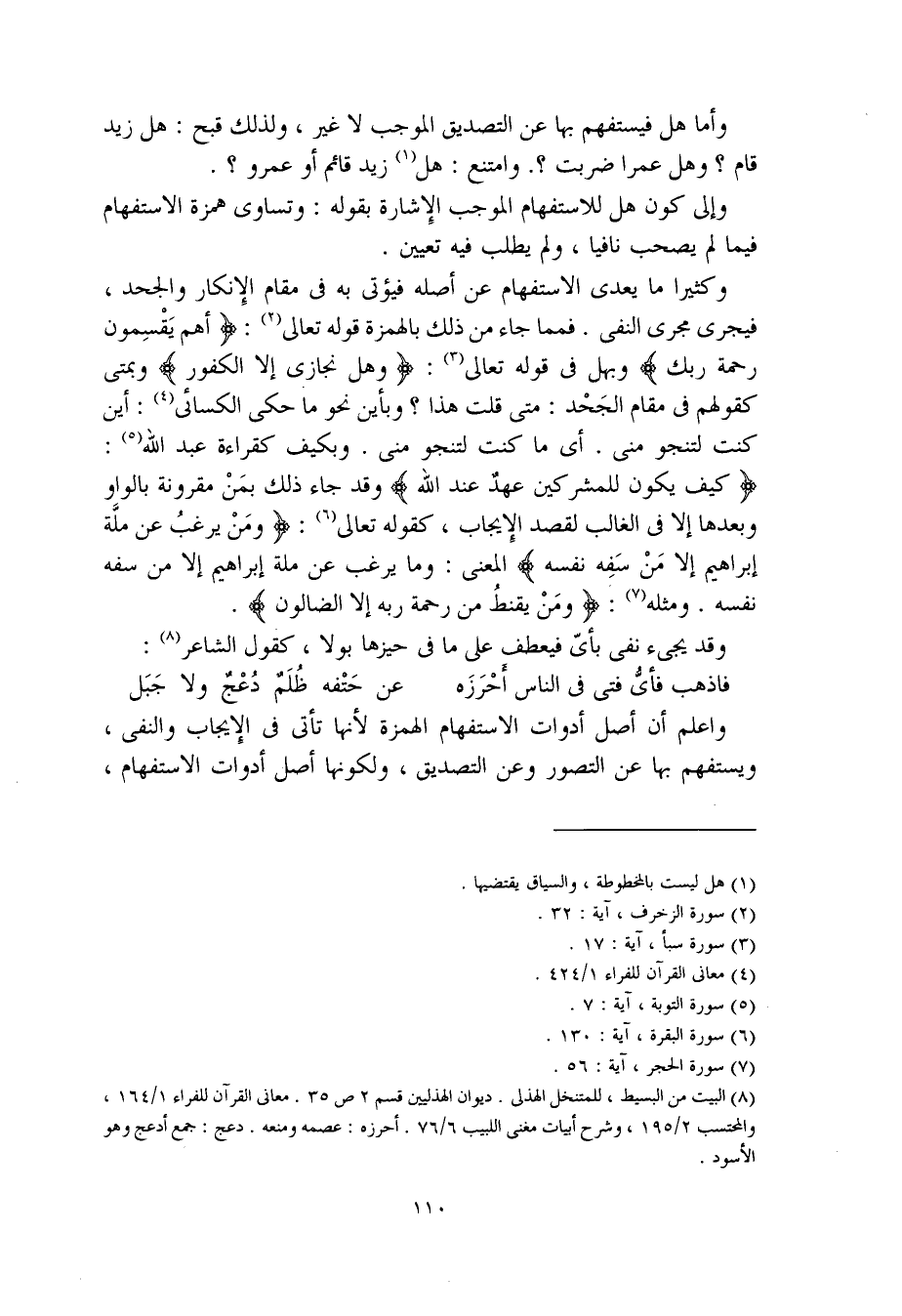 وكثيرا ما يعدى الاستفهام عن أصله فيؤتى به في مقام الإنكار والجحد، فيجرى مجرى النفي. فمما جاء من ذلك بالهمزة قوله تعالى: (أهم يَقْسِمون رحمة ربك) وبهل في قوله تعالى: (وهل نجازي إلا الكفور) وبمتى كقولهم في مقام الجَحْد: متى قلت هذا؟ وبأين نحو ما حكى الكسائي: أين كنت لتنجو مني. أي ما كنت لتنجو مني. وبكيف كقراءة عبد الله. (كيف يكون للمشركين عهدٌ عند الله) وقد جاء ذلك بمَنْ مقرونة بالواو وبعدها إلا في الغالب لقصد الإيجاب، كقوله تعالى: (ومَن يرغبُ عن ملَّة إبراهيم إلا مَنْ سَفِه نفسه) المعنى: وما يرغب عن ملة إبراهيم إلا من سفه نفسه. ومثله: (ومَن يقنطُ من رحمة ربه إلا الضالون).