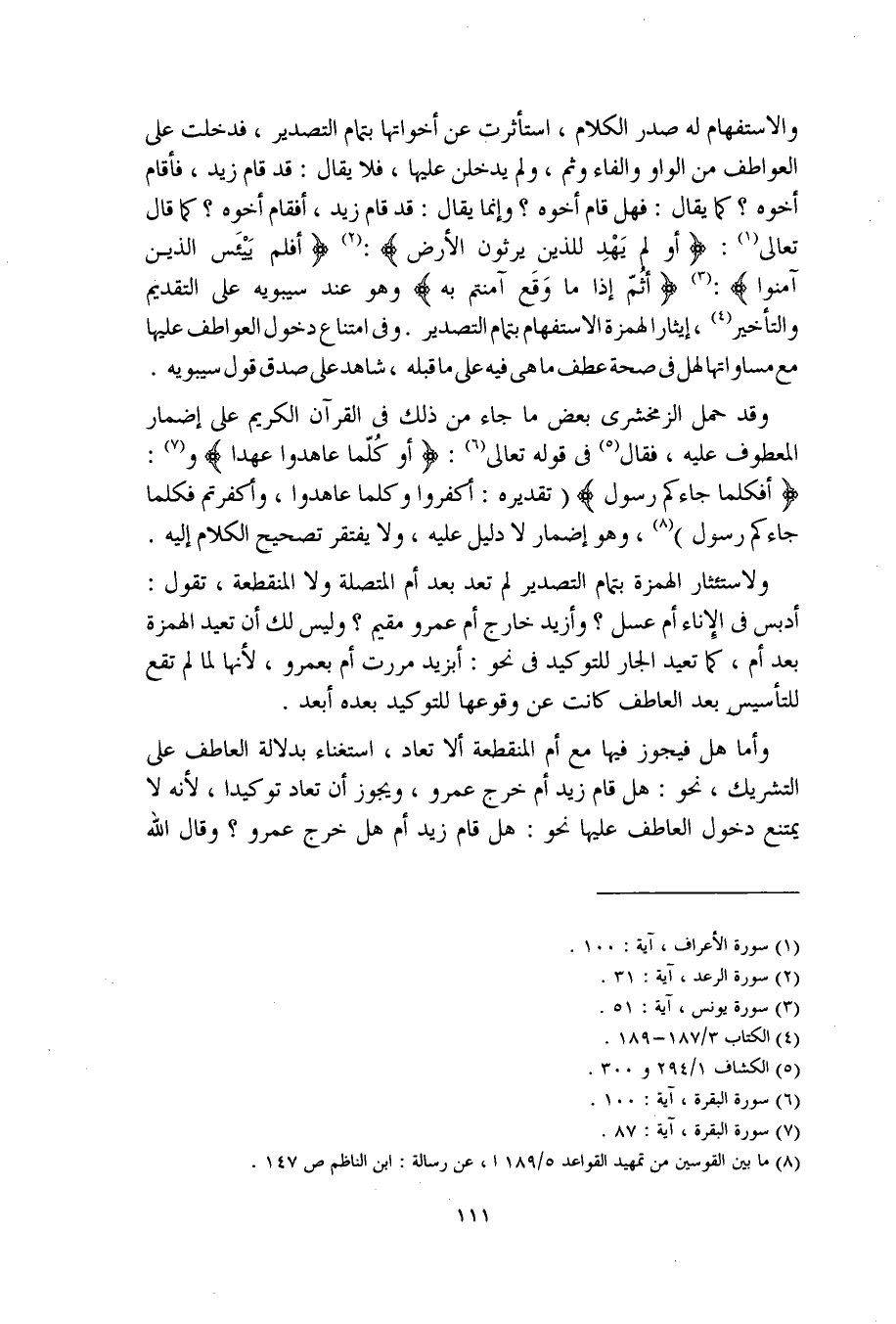 والاستفهام له صدر الكلام، استأثرت عن أخواتها بتمام التصدير، فدخلت على العواطف من الواو والفاء وثم، ولم يدخلن عليها، فلا يقال: قد قام زيد، فأقام أخوه؟ كما يقال: فهل قام أخوه؟ وإنما يقال: قد قام زيد، أفقام أخوه؟ كما قال تعالى: (أو لم يهدِ للذين يرثون الأرض): (أفلم يَيْئَس الذين آمنوا): (أثُمّ إذا ما وقع آمنتم به) وهو عند سيبويه على التقديم والتأخير، إيثار الهمزة الاستفهام بتمام التصدير. وفي امتناع دخول العواطف عليها مع مساواتها لهل في صحة عطف ما هي فيه على ما قبله، شاهد على صدق قول سيبويه.