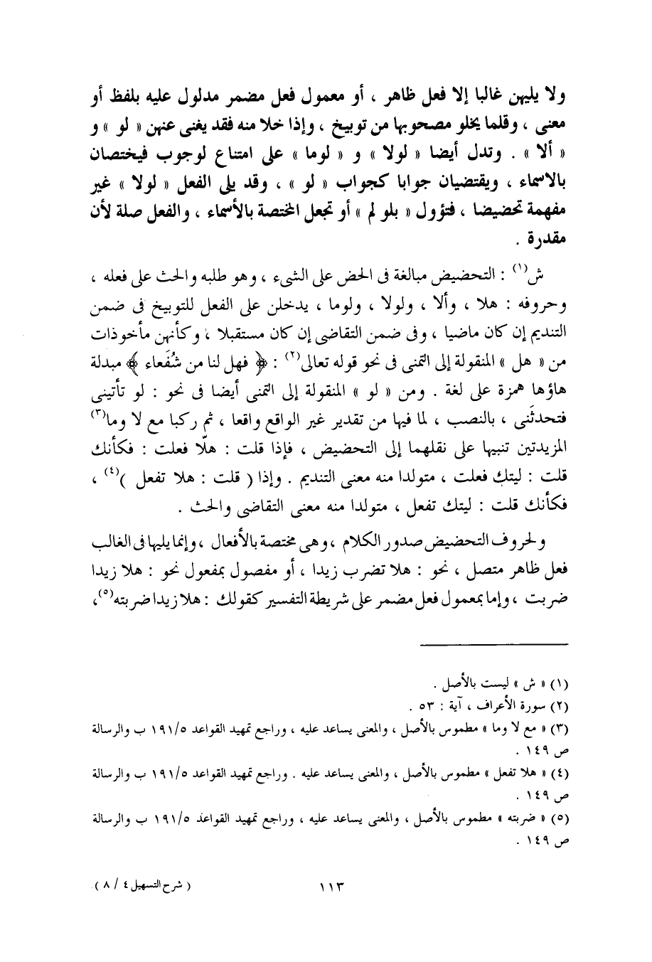 ش: التحضيض مبالغة في الحض على الشيء، وهو طلبه والحث على فعله، وحروفه: هلا، وألا، ولولا، ولوما، يدخلن على الفعل للتوبيخ في ضمن التنديم إن كان ماضيا، وفي ضمن التقاضي إن كان مستقبلا، وكأنهن مأخوذات من "هل" المنقولة إلى التمني في نحو قوله تعالى: (فهل لنا من شُفَعاء) مبدلة هاؤها همزة على لغة. ومن "لو" المنقولة إلى التمني أيضا في نحو: لو تأتيني فتحدثَني، بالنصب، لما فيها من تقدير غير الواقع واقعا، ثم ركبا مع لا وما المزيدتين تنبيها على نقلهما إلى التحضيض، فإذا قلت: هلّا فعلت: فكأنك قلت: ليتك فعلت، متولدا منه معنى التنديم. وإذا (قلت: هلا تفعل)، فكأنك قلت: ليتك تفعل، متولدا منه معنى التقاضي والحث.