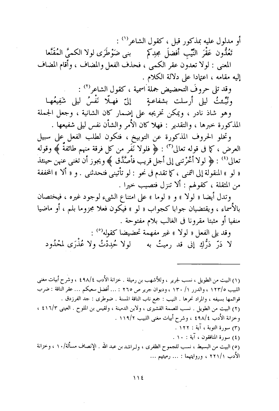 وتخلو الحروف المذكورة عن التوبيخ، فتكون لطلب الفعل على سبيل العرض، كما في قوله تعالى: (فلولا نَفَر من كل فرقة منهم طائفةٌ) وقوله تعالى: (لولا أخَّرْتَني إلى أجل قريب فأصَّدَّق) ويجوز أن تغني عنهن حينئذ "لو" المنقولة إلى التمني، كما تقدم في نحو: لو تأتيني فتحدثني. و"ألا" المخففة من المثقلة، كقولهم: ألا تنزل فتصيب خيرا.