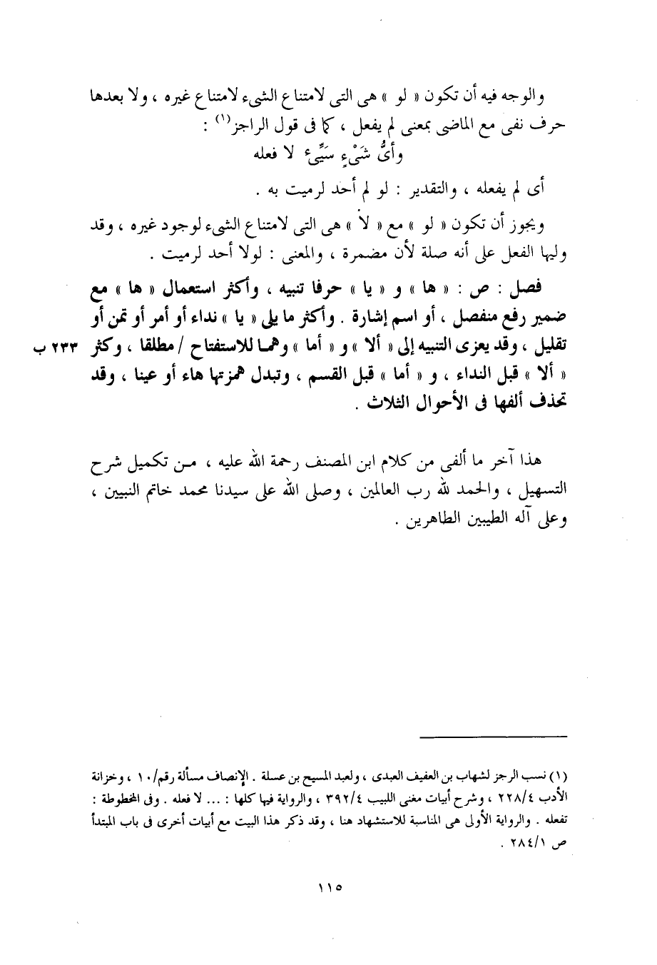 هذا آخر ما ألف من كلام ابن المصنف رحمة الله عليه، من تكميل شرح التسهيل، والحمد لله رب العالمين، وصلى الله على سيدنا محمد خاتم النبيين، وعلى آله الطيبين الطاهرين.