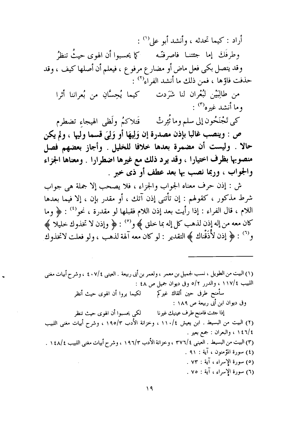 ش: إذن حرف معناه الجواب والجزاء، فلا يصحب إلا جملة هي جواب شرط مذكور، كقولهم: إن تأتني إذن آتك، أو مقدر بإن، إلا فيما بعدها اللام، قال الفراء: إذا رأيت بعد إذن اللام فقبلها لو مقدرة، نحو: (وما كان معه من إله إذن لذهب كل إله بما خلق) و: (وإذن لاتخذوك خليلا) و: (إذن لأذَقْناك) التقدير: لو كان معه آلهة لذهب، ولو فعلت لاتخذوك