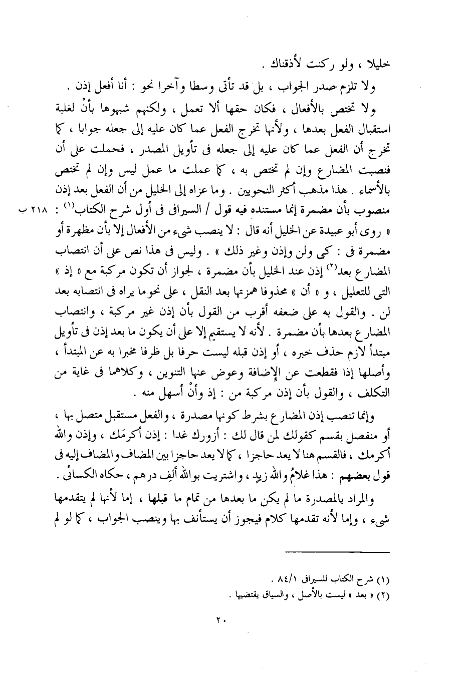 "روى أبو عبيدة عن الخليل أنه قال: لا ينصب شيء من الأفعال إلا بأن مظهرة أو مضمرة في: كي ولن وإذن وغير ذلك". وليس في هذا نص على أن انتصاب المضارع بعد إذن عند الخليل بأن مضمرة، لجواز أن تكون مركبة مع "إذ" التي للتعليل، و"أن" محذوفا همزتها بعد النقل، على نحو ما يراه في انتصابه بعد لن. والقول به على ضعفه أقرب من القول بأن إذن غير مركبة، وانتصاب المضارع بعدها بأن مضمرة. لأنه لا يستقيم إلا على أن يكون ما بعد إذن في تأويل مبتدأ لازم حذف خبره، أو إذن قبله ليست حرفا بل ظرفا مخبرا به عن المبتدأ، وأصلها إذا فقطعت عن الإضافة وعوض عنها التنوين، وكلاهما في غاية من التكلف، والقول بأن إذن مركبة من: إذ وأنْ أسهل منه.