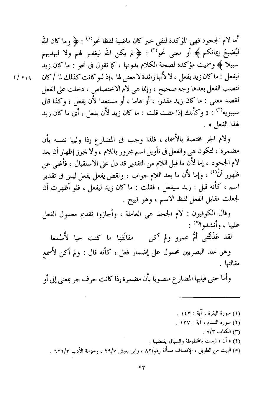 ولام الجر مختصة بالأسماء، فلذا وجب في المضارع إذا وليها نصبه بأن مضمرة، لتكون هي والفعل في تأويل اسم مجرور باللام، ولا يجوز إظهار أن بعد لام الجحود، إما لأن ما قبل اللام من التقدير قد دل على الاستقبال، فأغنى عن ظهور أنْ، وإما لأن ما بعد اللام جواب، ونقض يفعل بفعل ليس في تقدير اسم، كأنه قيل: زيد سيفعل، فقلت: ما كان زيد ليفعل، فلو أظهرت أن لجعلت مقابل الفعل لفظ الاسم، وهو قبيح.