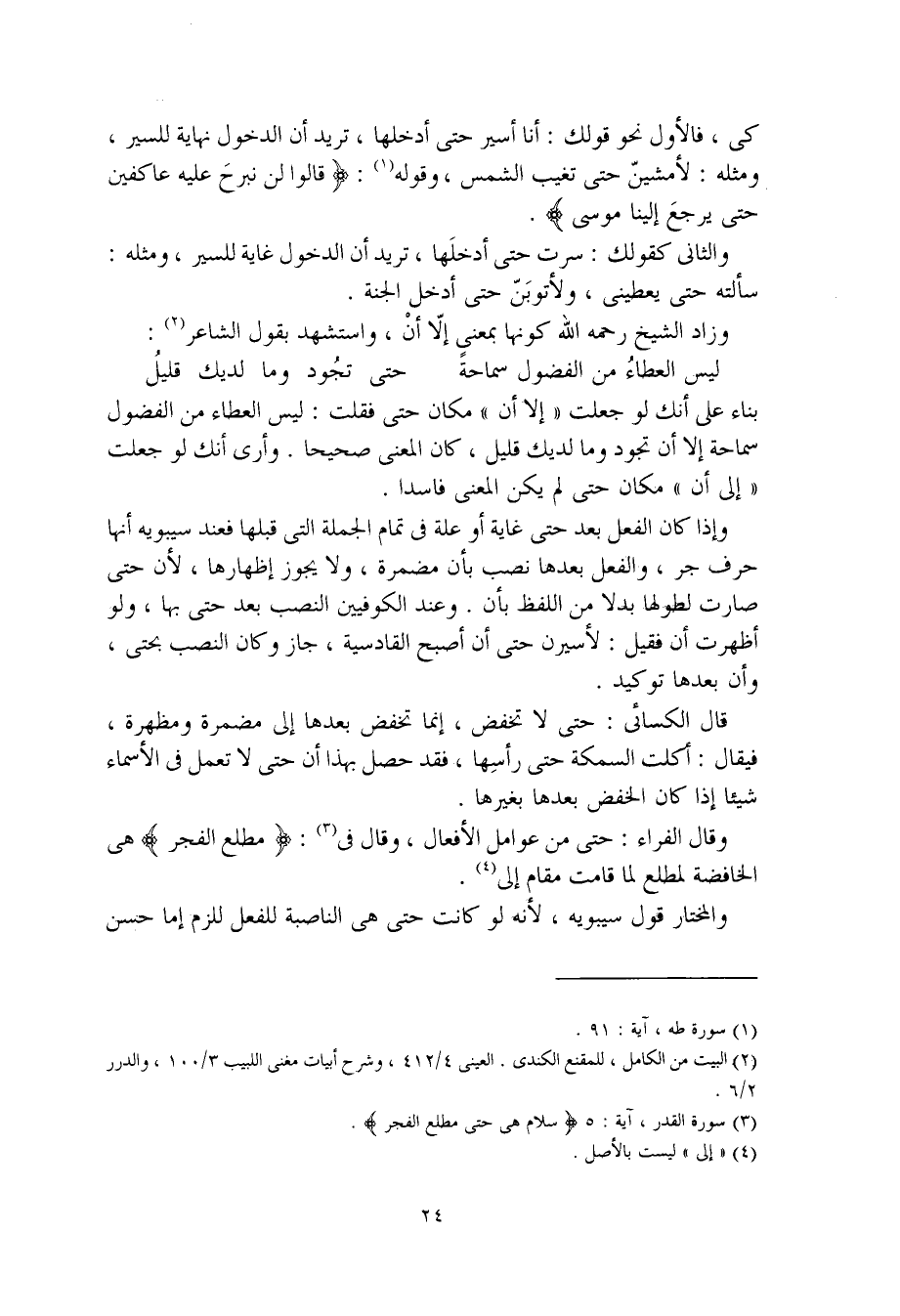 وإذا كان الفعل بعد حتى غاية أو علة في تمام الجملة التي قبلها فعند سيبويه أنها حرف جر، والفعل بعدها نصب بأن مضمرة، ولا يجوز إظهارها، لأن حتى صارت لطولها بدلا من اللفظ بأن. وعند الكوفيين النصب بعد حتى بها، ولو أظهرت أن فقيل: لأسيرن حتى أن أصبح القادسية، جاز وكان النصب بحتى، وأن بعدها توكيد.