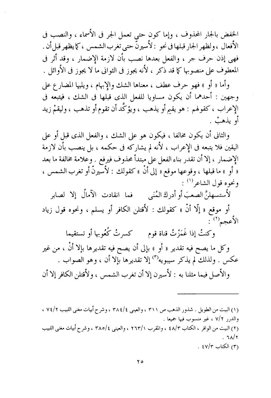 والثاني أن يكون مخالفا، فيكون هو على الشك، والفعل الذي قبل أو على اليقين فلا يتبعه في الإعراب، لأنه لم يشاركه في حكمه، بل ينصب بأن لازمة الإضمار، إلا أن تقدر بناء الفعل على مبتدأ محذوف فيرفع. وعلامة مخالفة ما بعد "أو" ما قبلها، وقوعها موقع "إلى أنْ" كقولك: لأسيرنّ أو تغرب الشمس، ونحوه قول الشاعر: