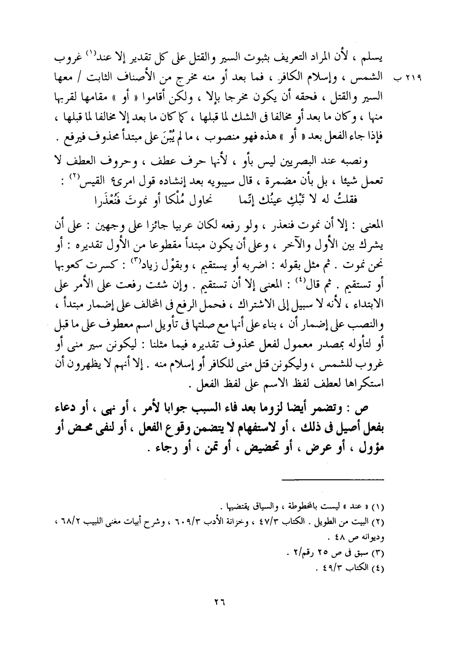 المعنى: إلا أن نموت فنعذر، ولو رفعه لكان عربيا جائزا على وجهين: على أن يشرك بين الأول والآخر، وعلى أن يكون مبتدأ مقطوعا من الأول تقديره: أو نحن نموت. ثم مثل بقوله: اضربه أو يستقيم، وبقوْل زياد: كسرت كعوبها أو تستقيم. ثم قال: المعنى إلا أن تستقيم. وإن شئت رفعت على الأمر على الابتداء، لأنه لا سبيل إلى الاشتراك، فحمل الرفع في المخالف على إضمار مبتدأ، والنصب على إضمار أن، بناء على أنها مع صلتها في تأويل اسم معطوف على ما قبل أو لتأوله بمصدر معمول لفعل محذوف تقديره فيما مثلنا: ليكونن سير مني أو غروب الشمس، وليكونن قتل مني للكافر أو إسلام منه. إلا أنهم لا يظهرون أن استكراها لعطف لفظ الاسم على لفظ الفعل.