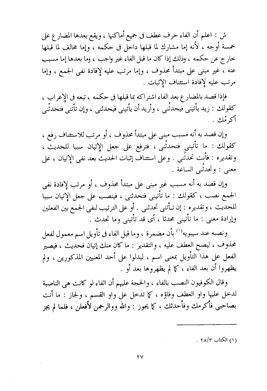 ش: اعلم أن الفاء حرف عطف في جميع أماكنها، ويقع بعدها المضارع على خمسة أوجه، لأنه إما مشارك لما قبلها داخل في حكمه، وإما مخالف لما قبلها خارج عن حكمه، وذلك إذا كان ما قبل الفاء غير واجب، وما بعدها إما مسبب عنه، غير مبني على مبتدأ محذوف، وإما مرتب عليه لإفادة نفي الجمع، وإما مرتب عليه لإفادة استئناف الإثبات.