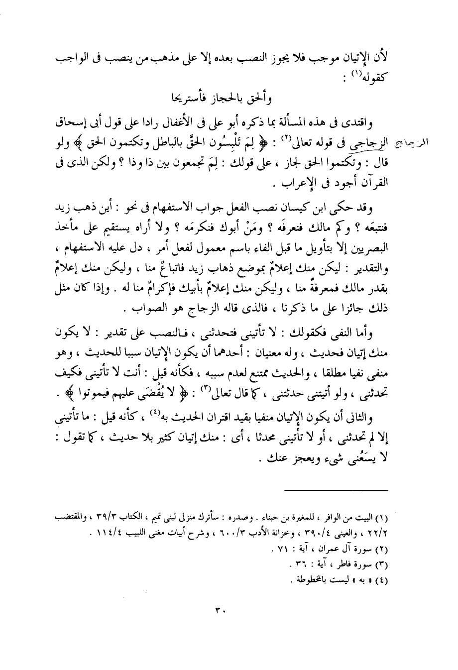 واقتدى في هذه المسألة بما ذكره أبو علي في الإغفال رادا على قول أبي إسحاق الزجاج في قوله تعالى: (لِم تلبسون الحقَّ بالباطل وتكتمون الحق) ولو قال: وتكتموا الحق لجاز، على قولك: لِمَ تجمعون بين ذا وذا؟ ولكن الذي في القرآن أجود في الإعراب.