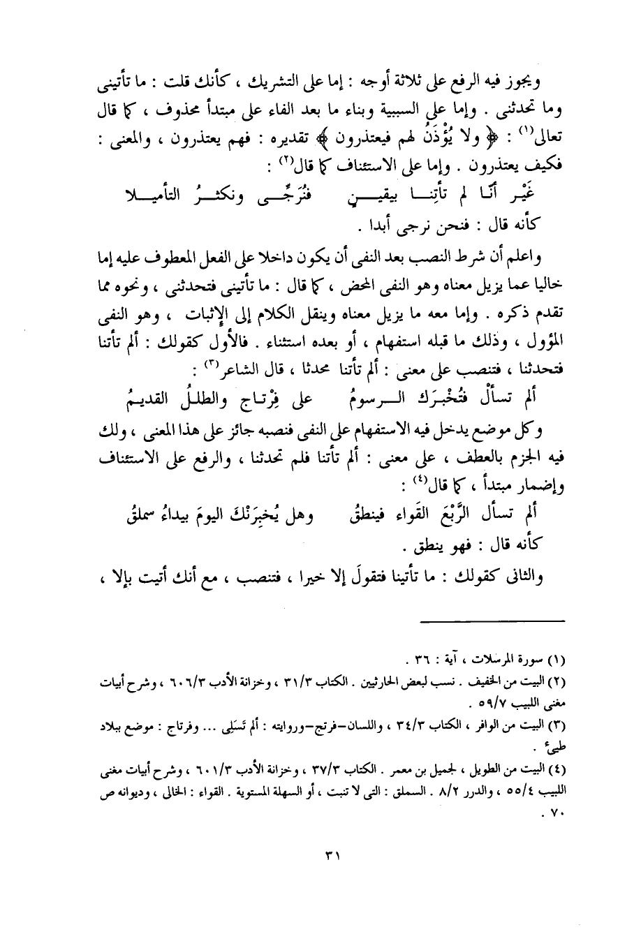 واعلم أن شرط النصب بعد النفي أن يكون داخلا على الفعل المعطوف عليه إما خاليا عما يزيل معناه وهو النفي المحض، كما قال: ما تأتيني فتحدثني، ونحوه مما تقدم ذكره. وإما معه ما يزيل معناه وينقل الكلام إلى الإثبات، وهو النفي المؤول، وذلك ما قبله استفهام، أو بعده استثناء. فالأول كقولك: ألم تأتنا فتحدثنا، فتنصب على معنى: ألم تأتنا محدثا، قال الشاعر: