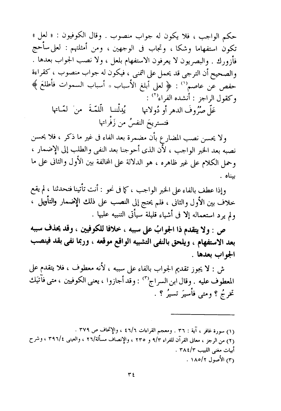 حكم الواجب، فلا يكون له جواب منصوب. وقال الكوفيون: "لعل" تكون استفهاما وشكا، وتجاب في الوجهين، ومن أمثلتهم: لعلي سأحج فأزورك. والبصريون لا يعرفون الاستفهام بلعل، ولا نصب الجواب بعدها.