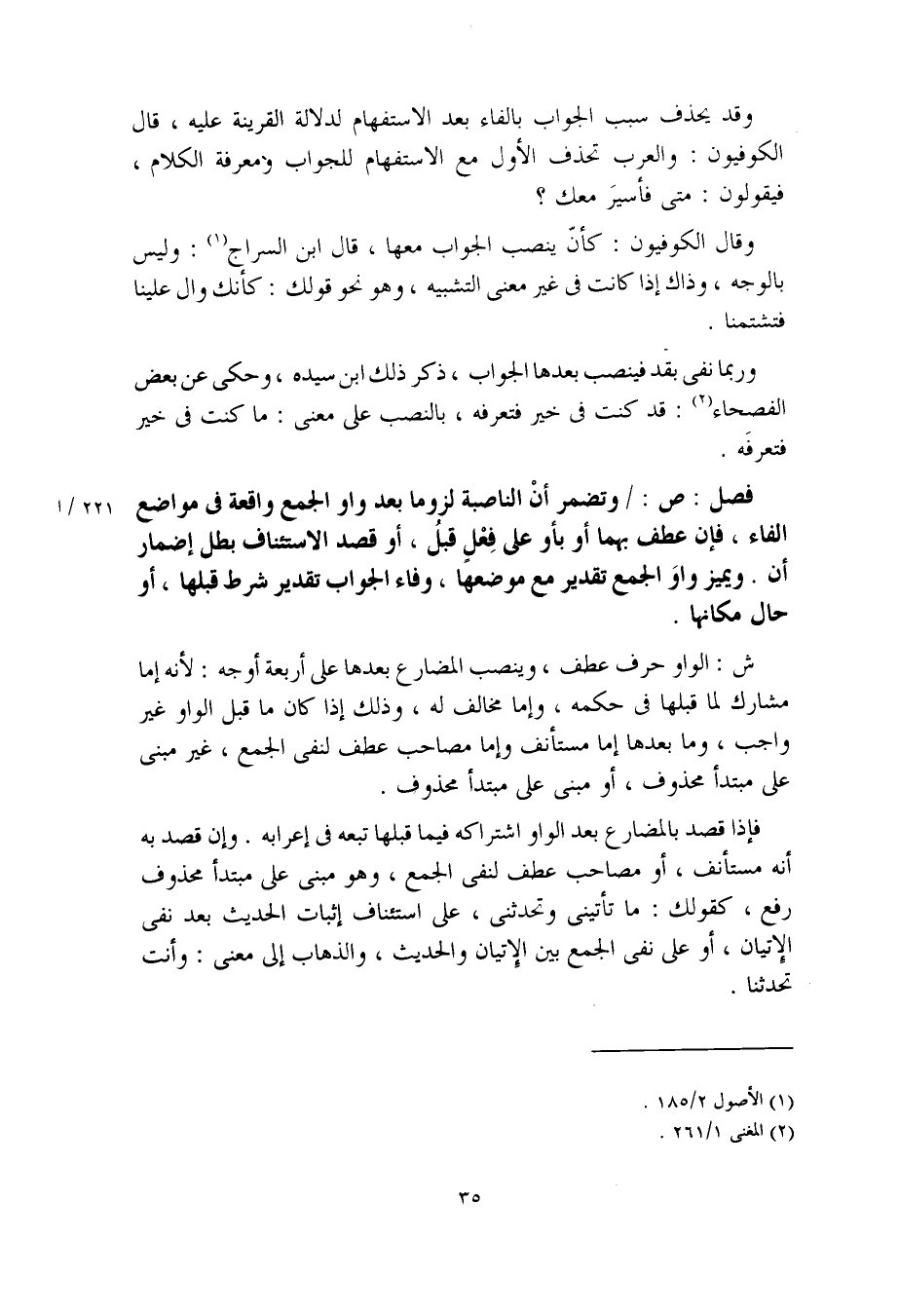 وقال الكوفيون: كأنّ ينصب الجواب معها، قال ابن السراج: وليس بالوجه، وذاك إذا كانت في غير معنى التشبيه، وهو نحو قولك: كأنك وال علينا فتشتمنا.